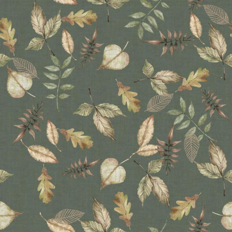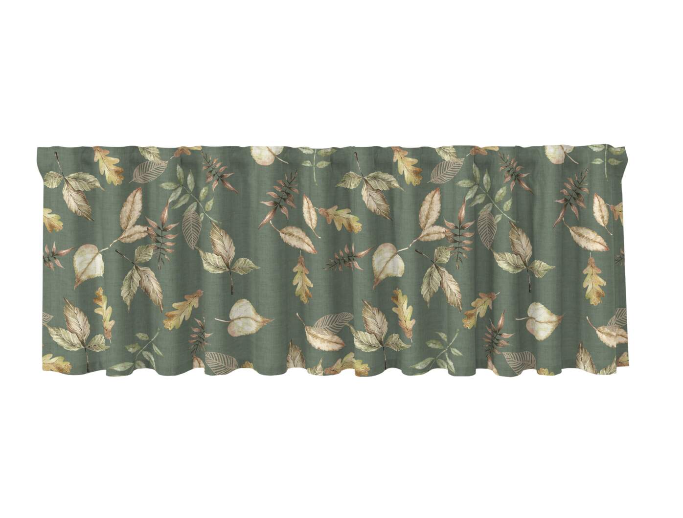 Gardinkappa FALLING EMBER på metervara med löv i brunt på grön bottenfärg