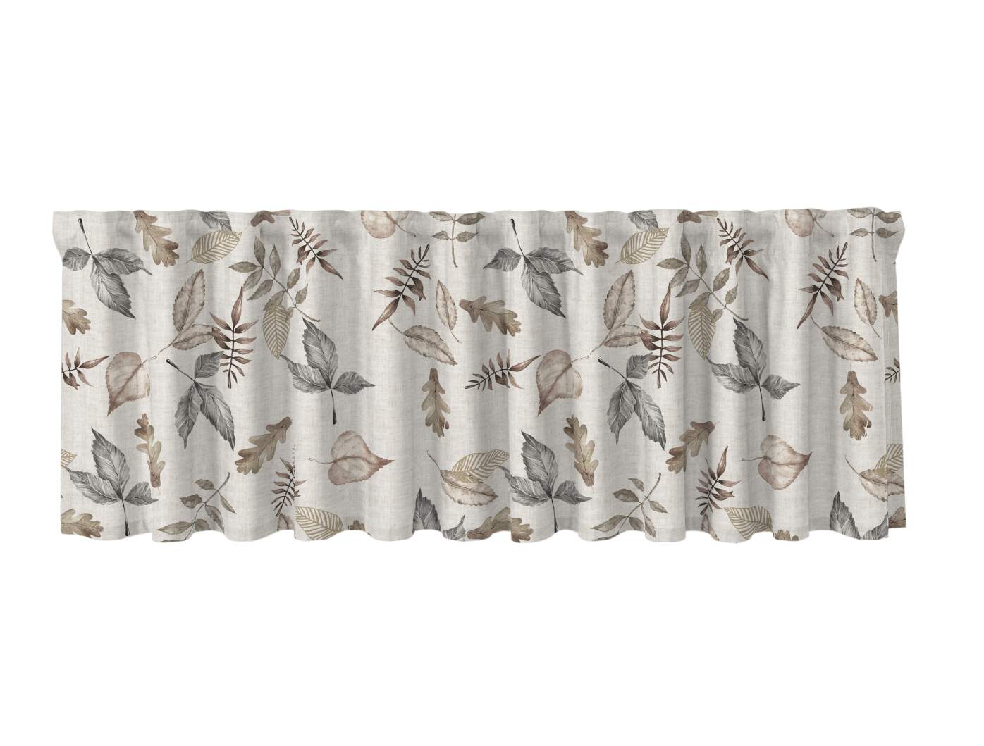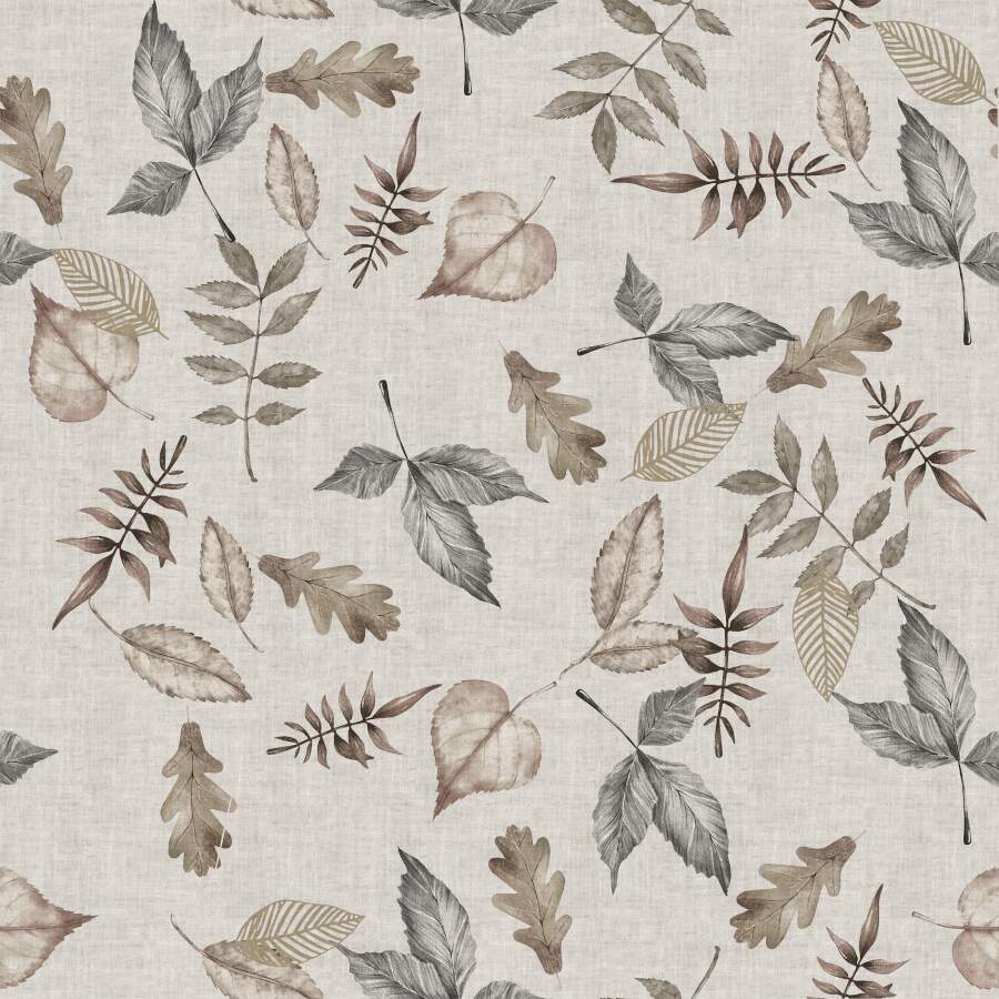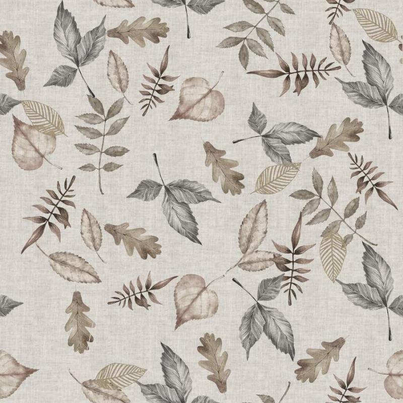 Gardinkappa FALLING EMBER på metervara med löv i grått och brunt