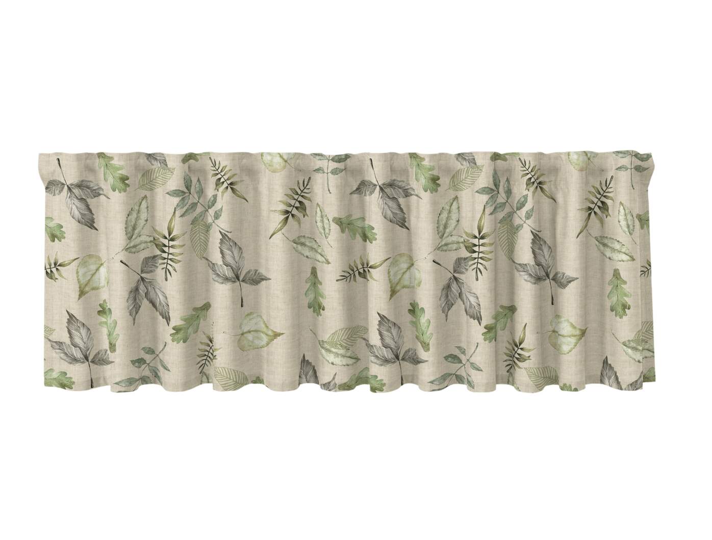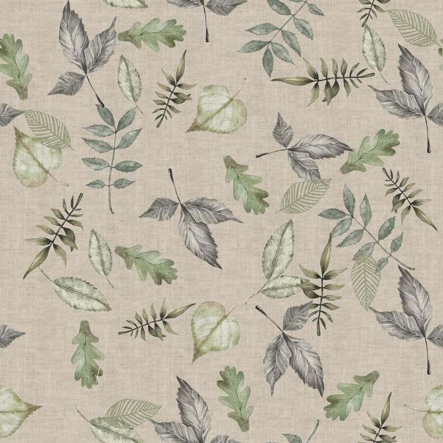 Gardinkappa FALLING EMBER på metervara med löv i grått och grönt