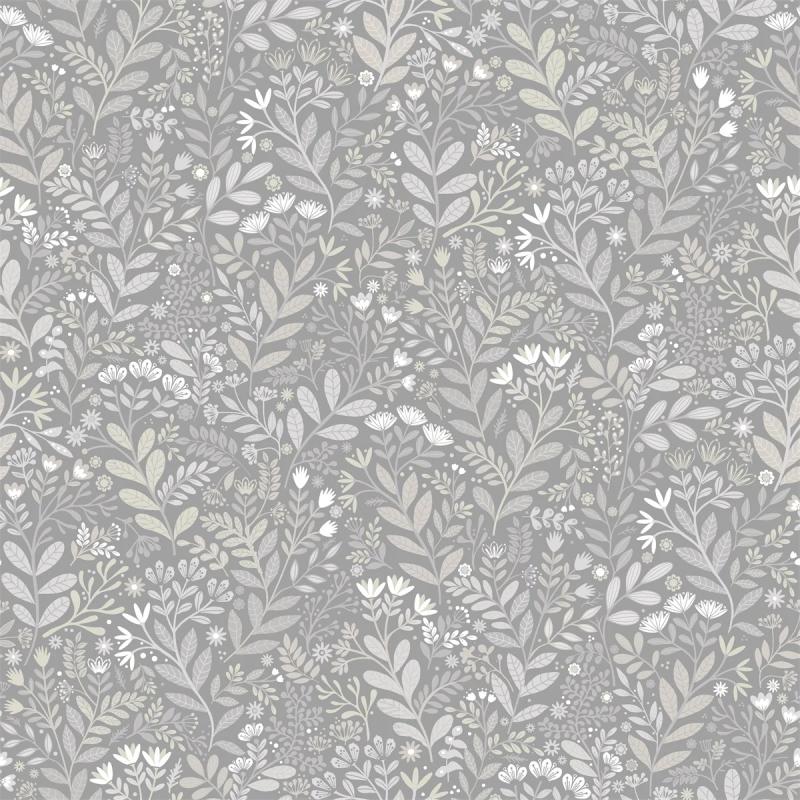 Gardinkappa HAGE på metervara, blad och blommor i grått och beige