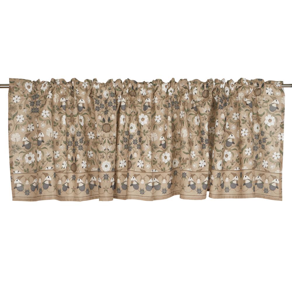 Gardinkappa JULEFRID med tomtar, blommor och ekorrar i grönt på beige bottenfärg