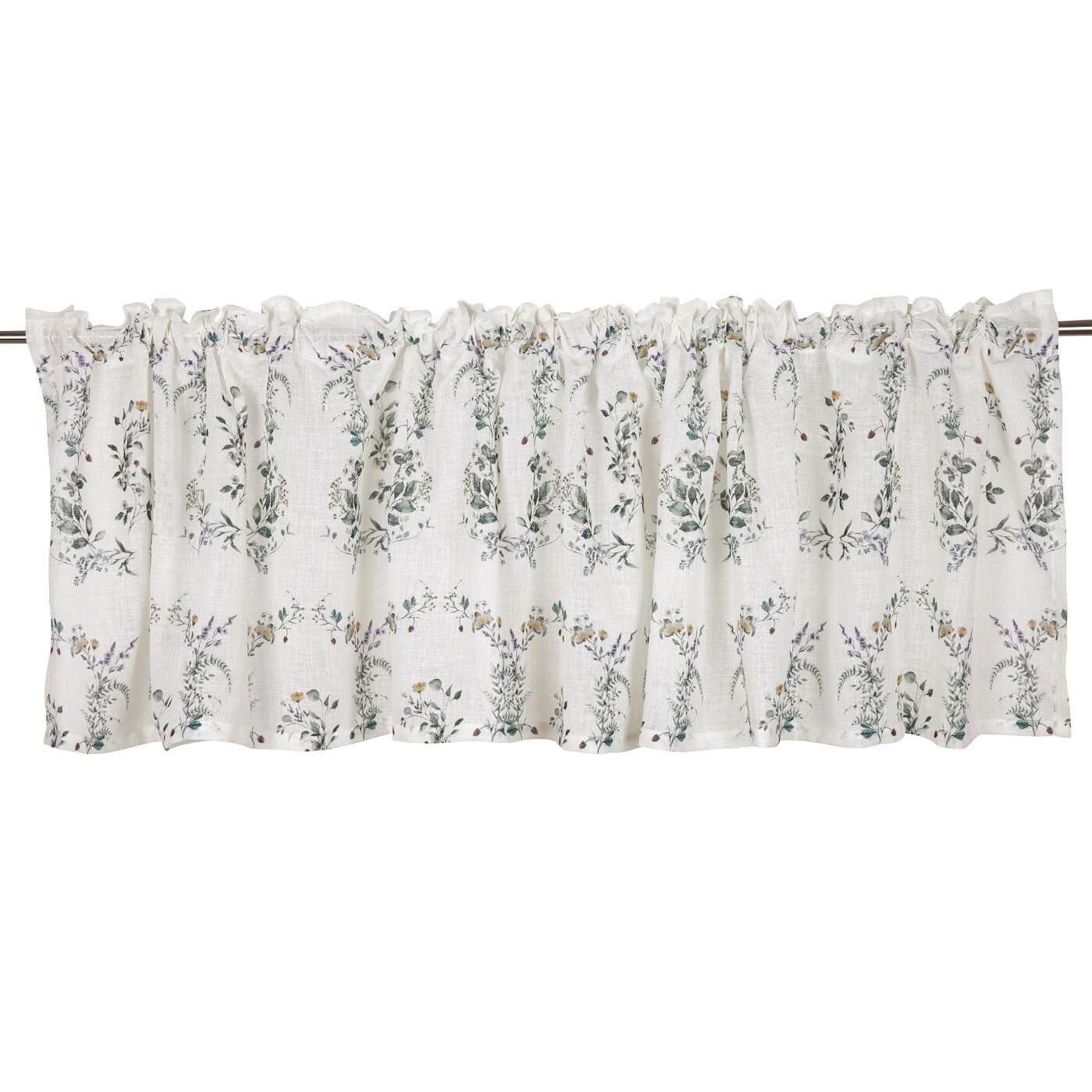 Stl. 55X250 CM. Gardinkappa SMULTRON i tunn, skir kvalitet som släpper igenom ljuset på ett mjukt och behagligt sätt. Den pryds av ett småblommigt mönster med smultron och blad som ger en romantisk och lantlig känsla. Kappan har påsytt multiband och kan hängas upp med rynkbandskrokar, fingerkrokar, kanal samt dold hälla.