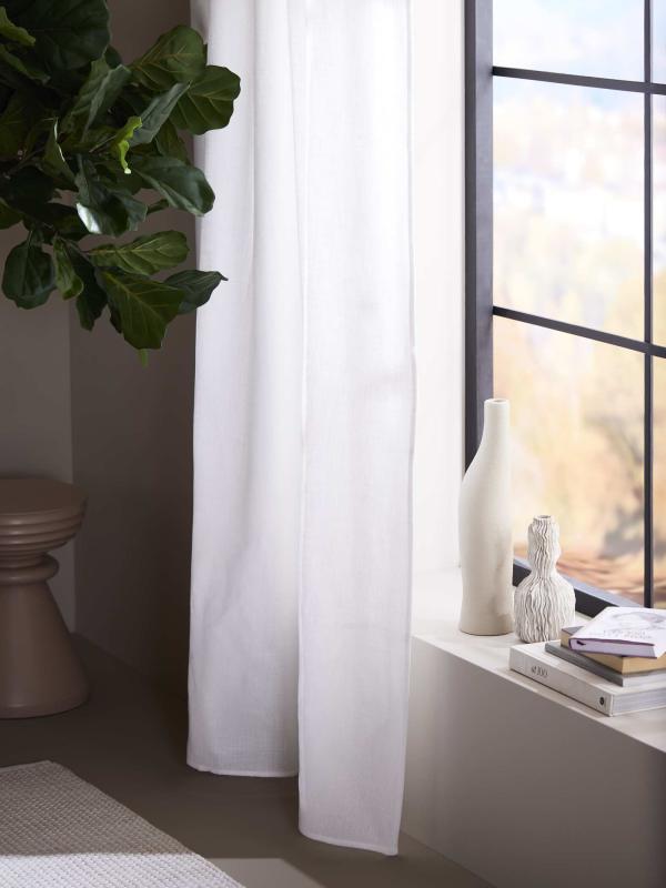 Gardinerna har multiband i ovankant, fållade långsidor och overlocksöm i nederkant. Använd snabbfållningsband för att få rätt längd på gardinen.