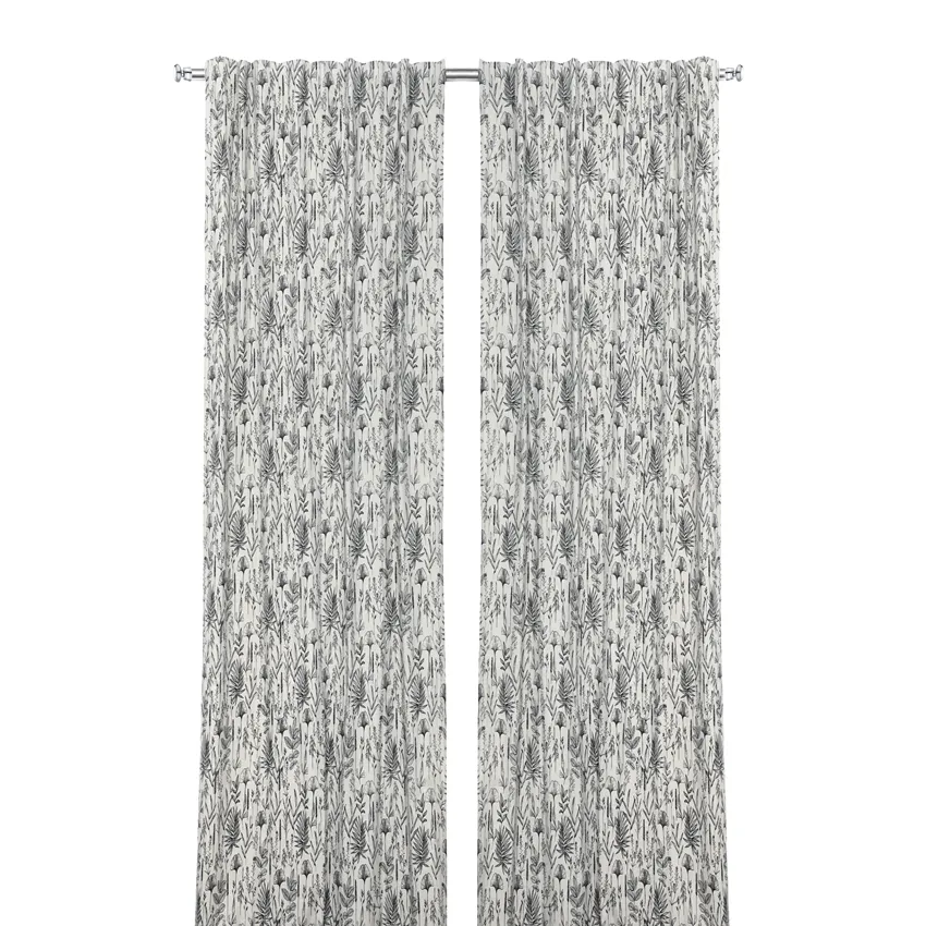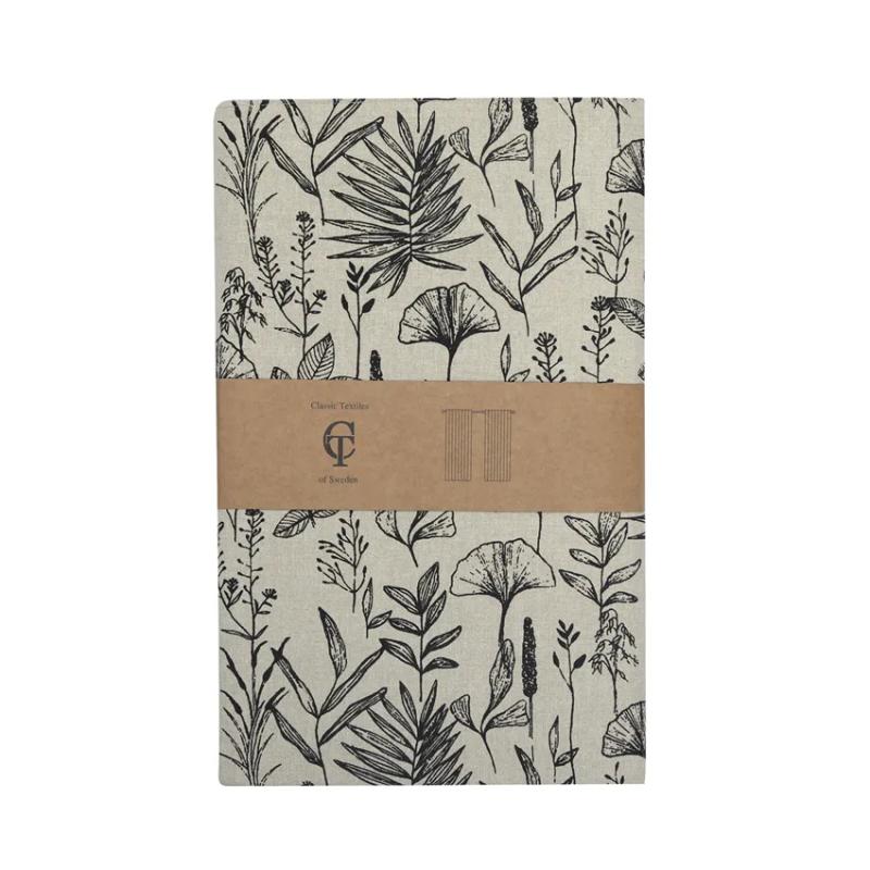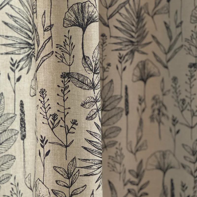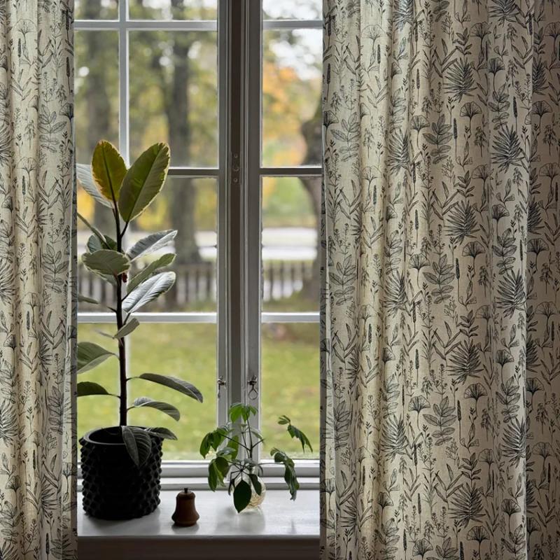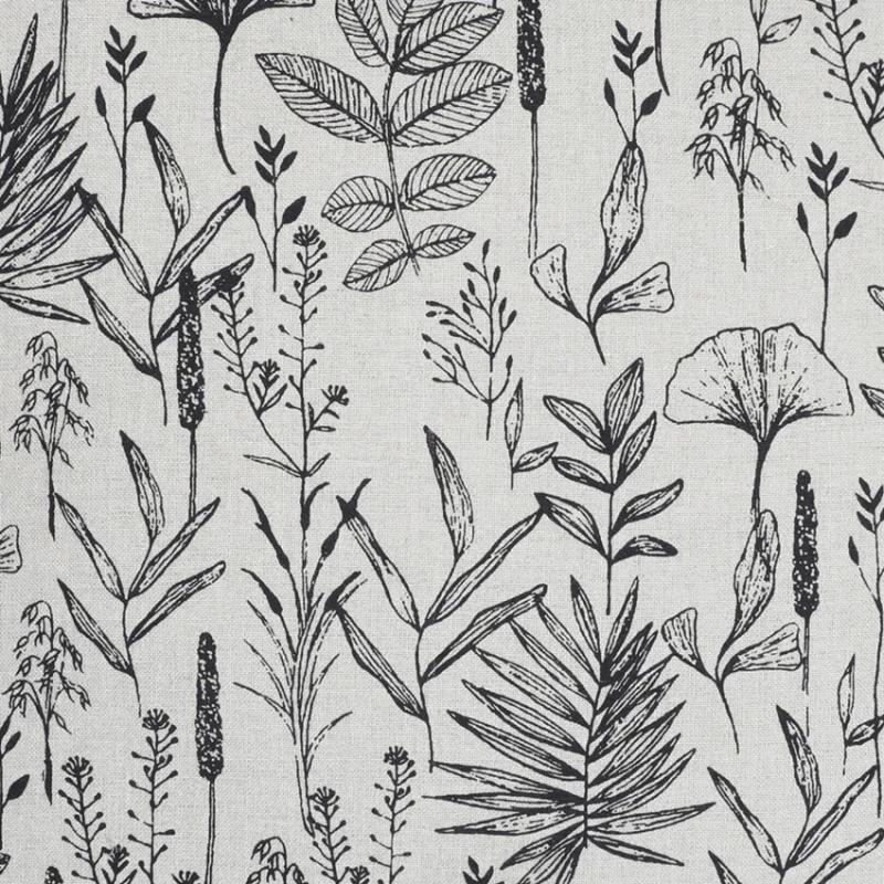Gardinlängd RALF, återvunnet material, med tryckta växter i svart på linnefärgad botten