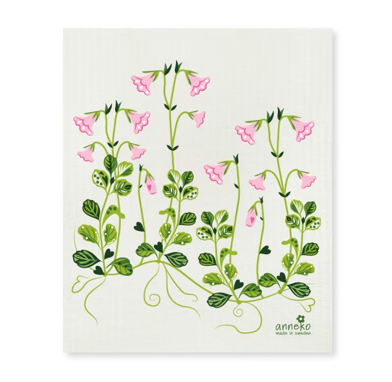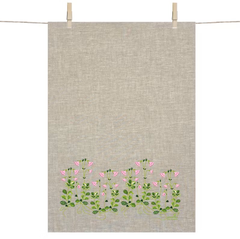 Gåvosetet med “LINNEA”, designad av Anneli Asplund, är ett set med disktrasa och kökshandduk med motiv av blomman Linnea