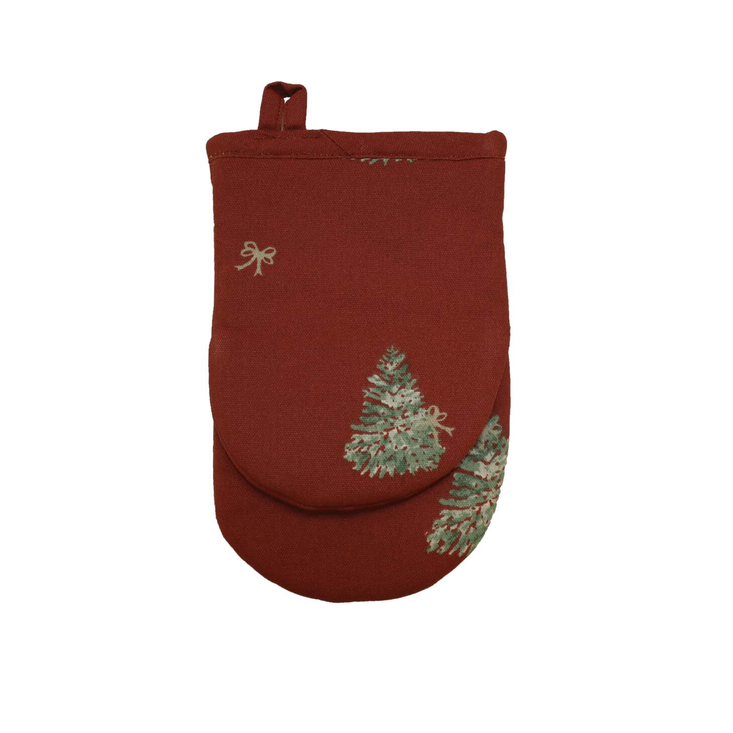 Grillvante CHRISTMAS TREE med gröna granar och beige rosetter på röd botten