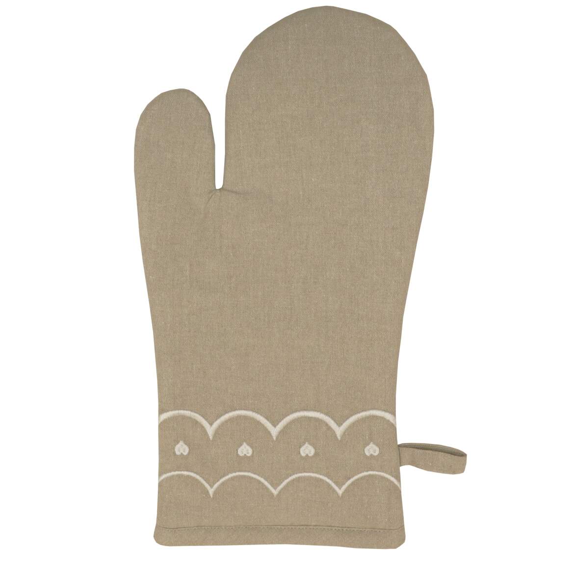 Grillvante MAJKEN i linnefärg med vita broderade hjärtan och vågig kant