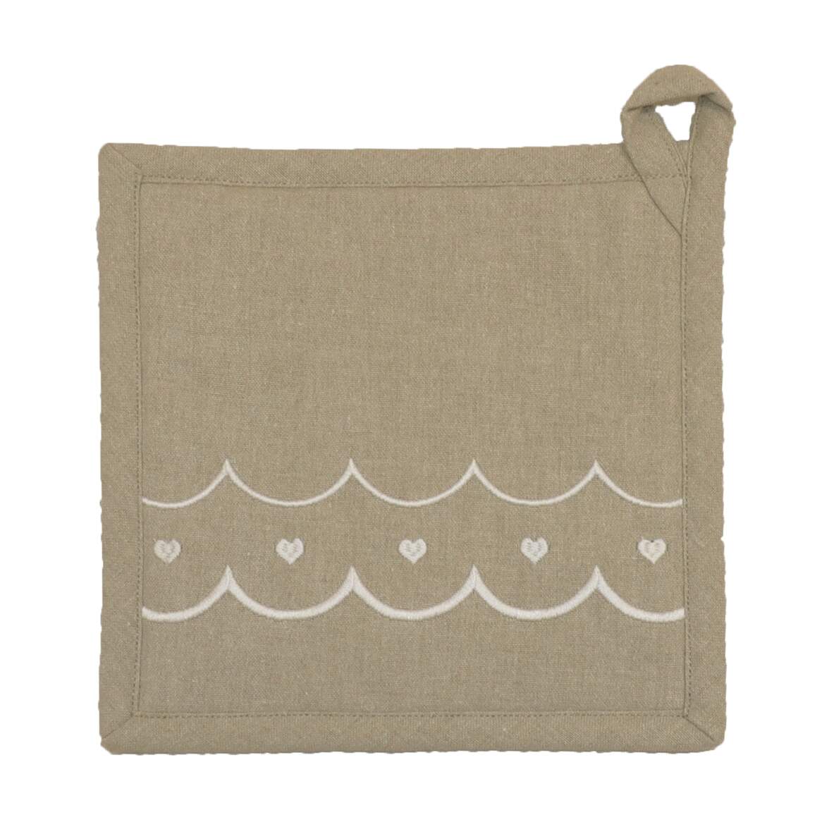 Grytlapp MAJKEN i linnefärg med vita broderade hjärtan och vågig kant