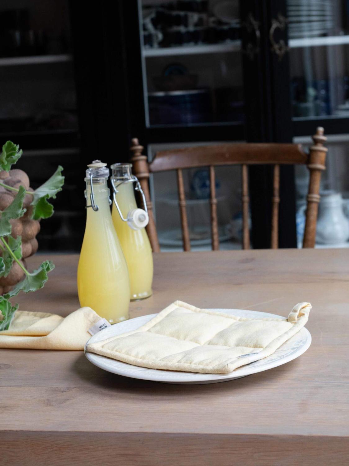 Grytlapp VIDE återvunnen textil, enfärgad gul med stickningar,