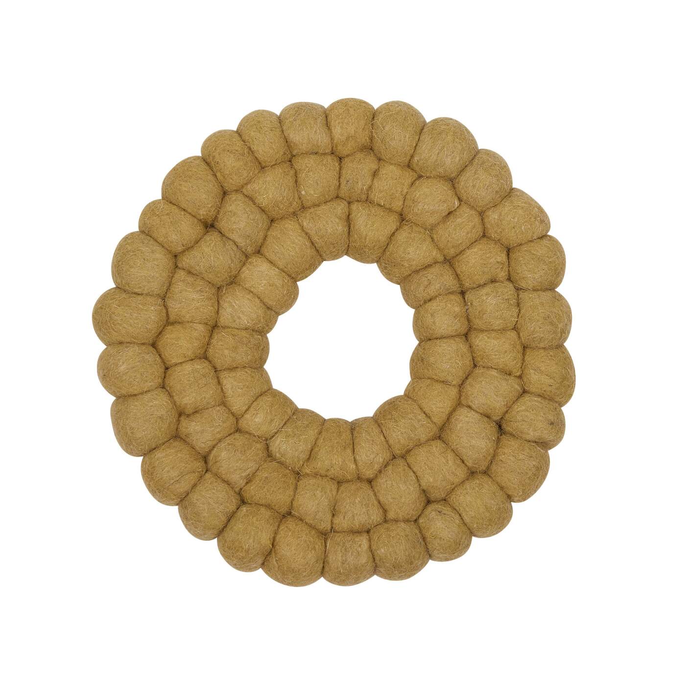 Diameter 19 cm . Grytunderlägg RULLE, tillverkad i tuvad ull. Små tovade bollar sammansatta i tre ringar bildar ett praktiskt grytunderlägg