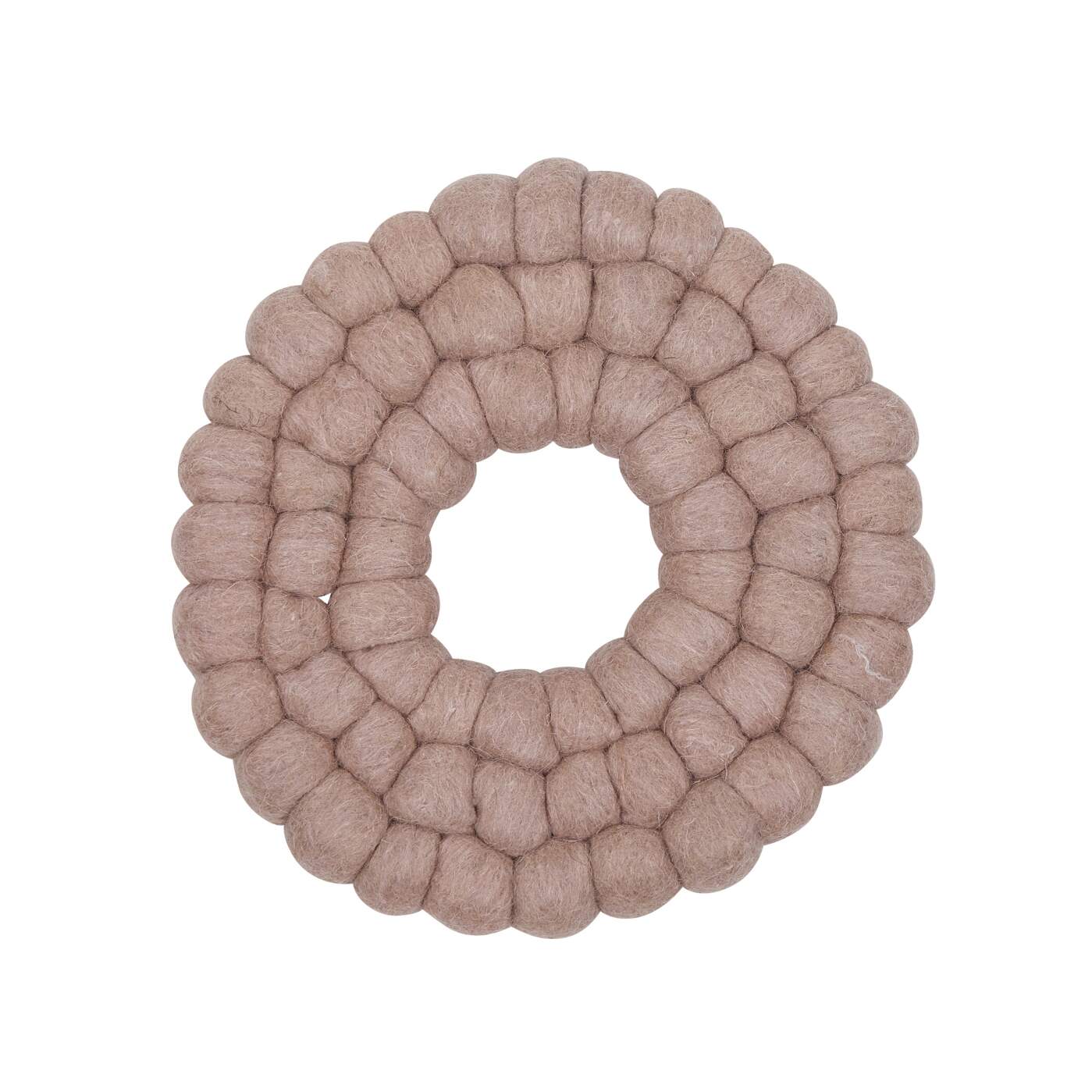 Diameter 19 cm . Grytunderlägg RULLE, tillverkad i tuvad ull. Små tovade bollar sammansatta i tre ringar bildar ett praktiskt grytunderlägg