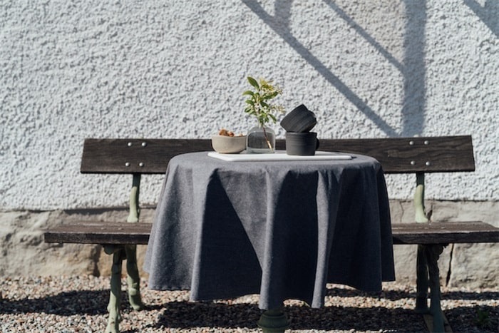 HEDVIG, Rund enfärgad duk, mörkgrå, chambray med avtorkningsbar yta. Funkar lika bra ute som inne.