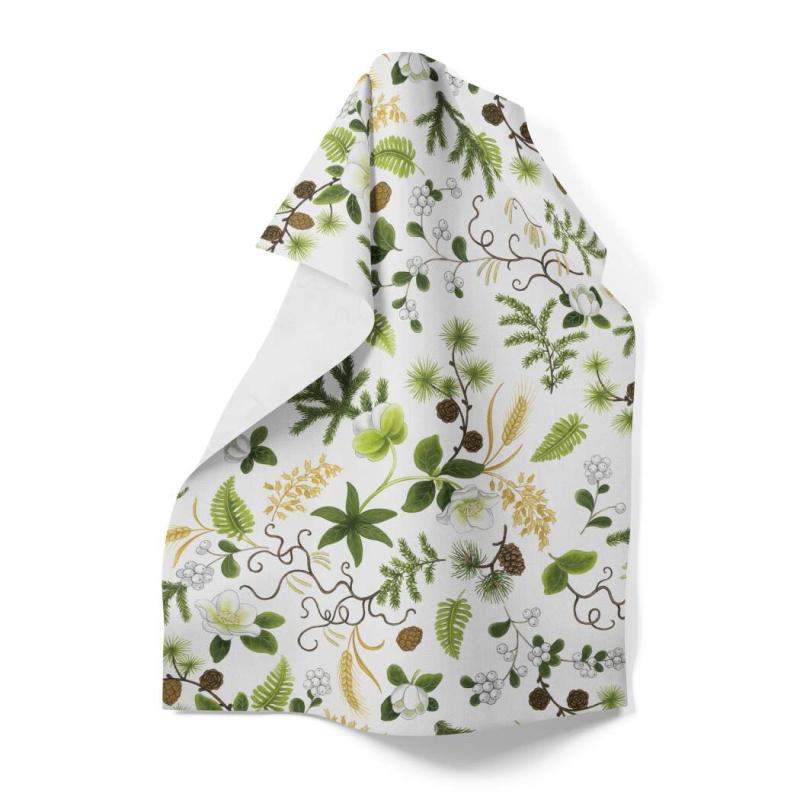 Kökshandduk BARR och BLOM med julrosor, kottar och granris i vitt, brunt, gult och grönt