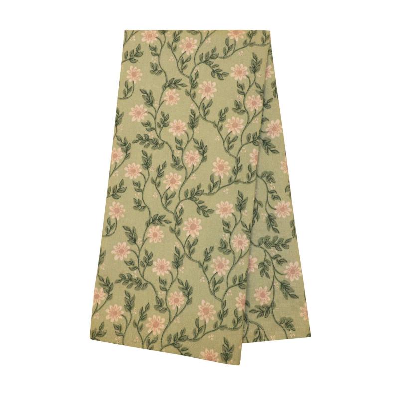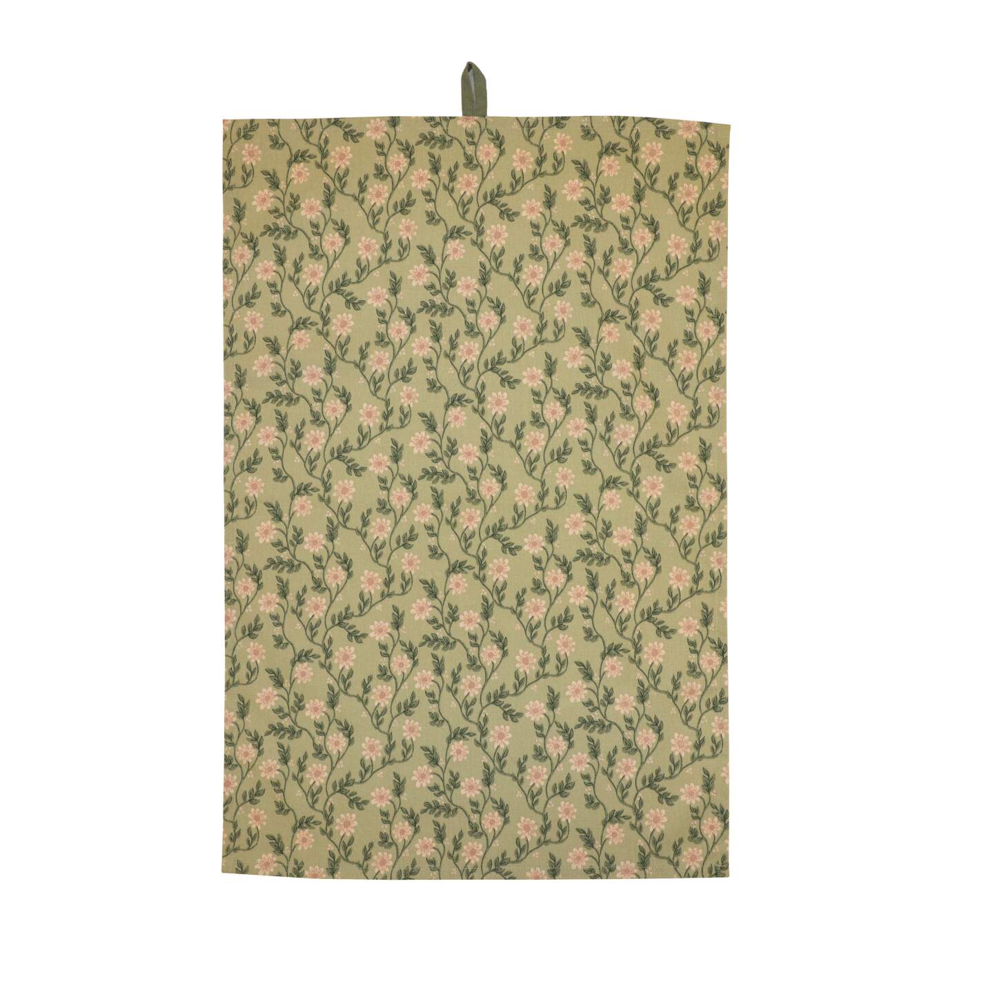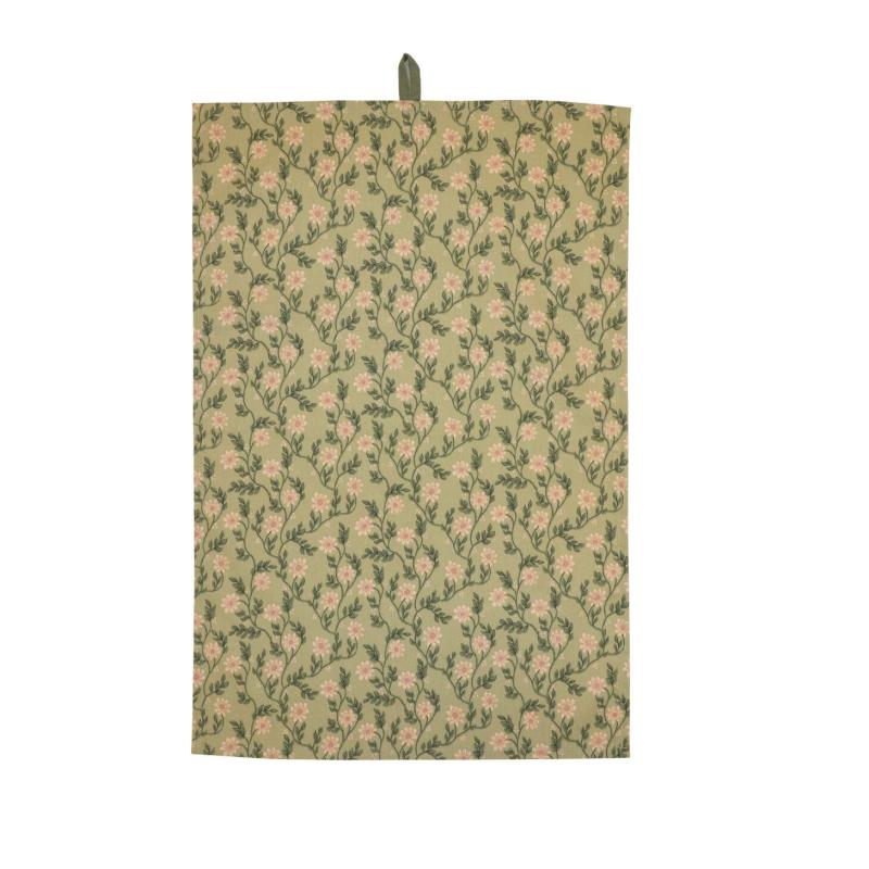 Kökshandduk FANNY med beige blommor och gröna blad på grön bottenfärg