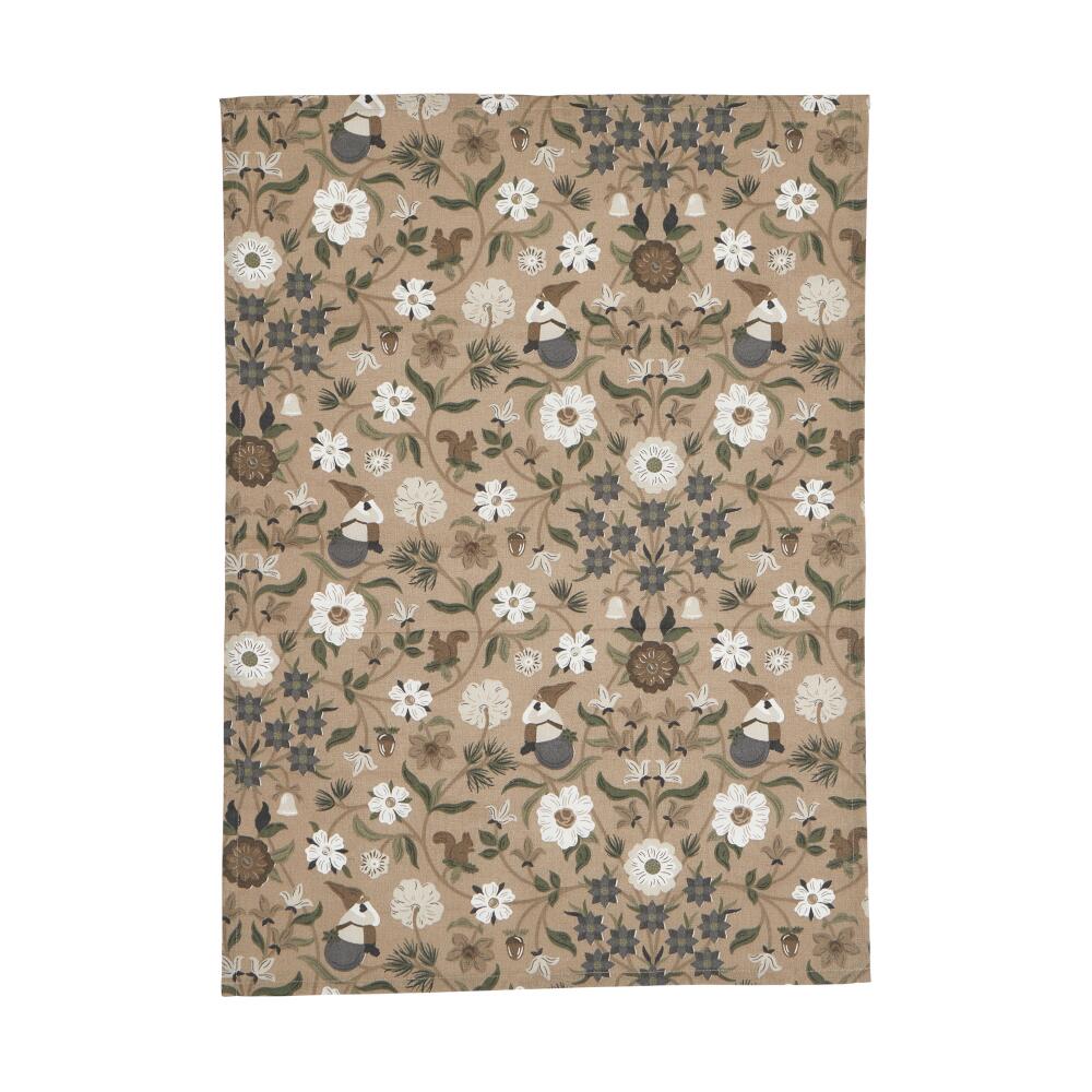 Kökshandduk JULEFRID med tomtar, blommor och ekorrar i grönt på beige bottenfärg