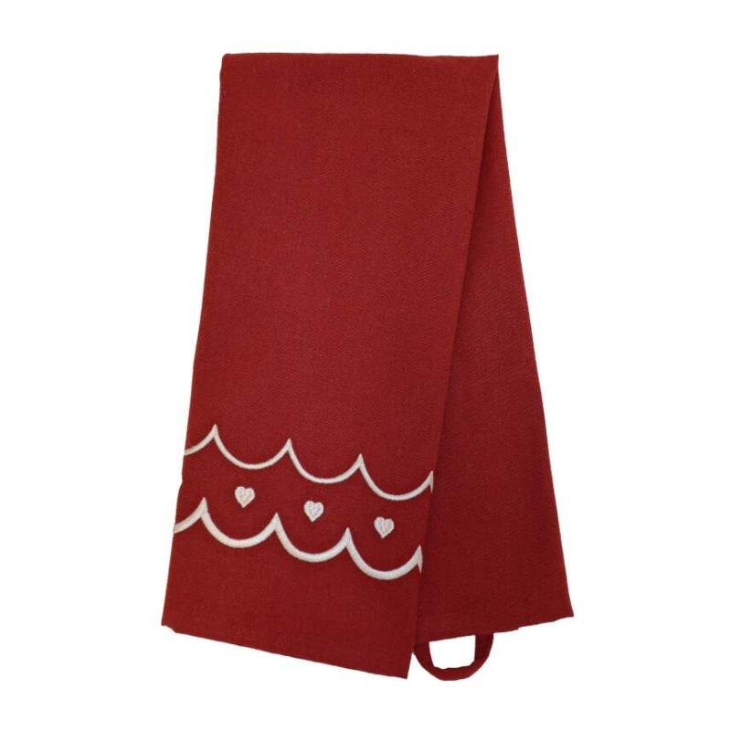 Kökshandduk MAJKEN i rött med vita broderade hjärtan och vågig kant