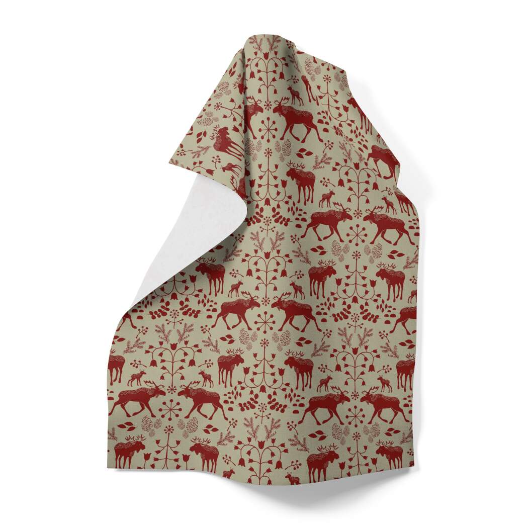 Kökshandduk SKOGENS KONUNG (Culla) med älgar i rött på linnefärgad botten