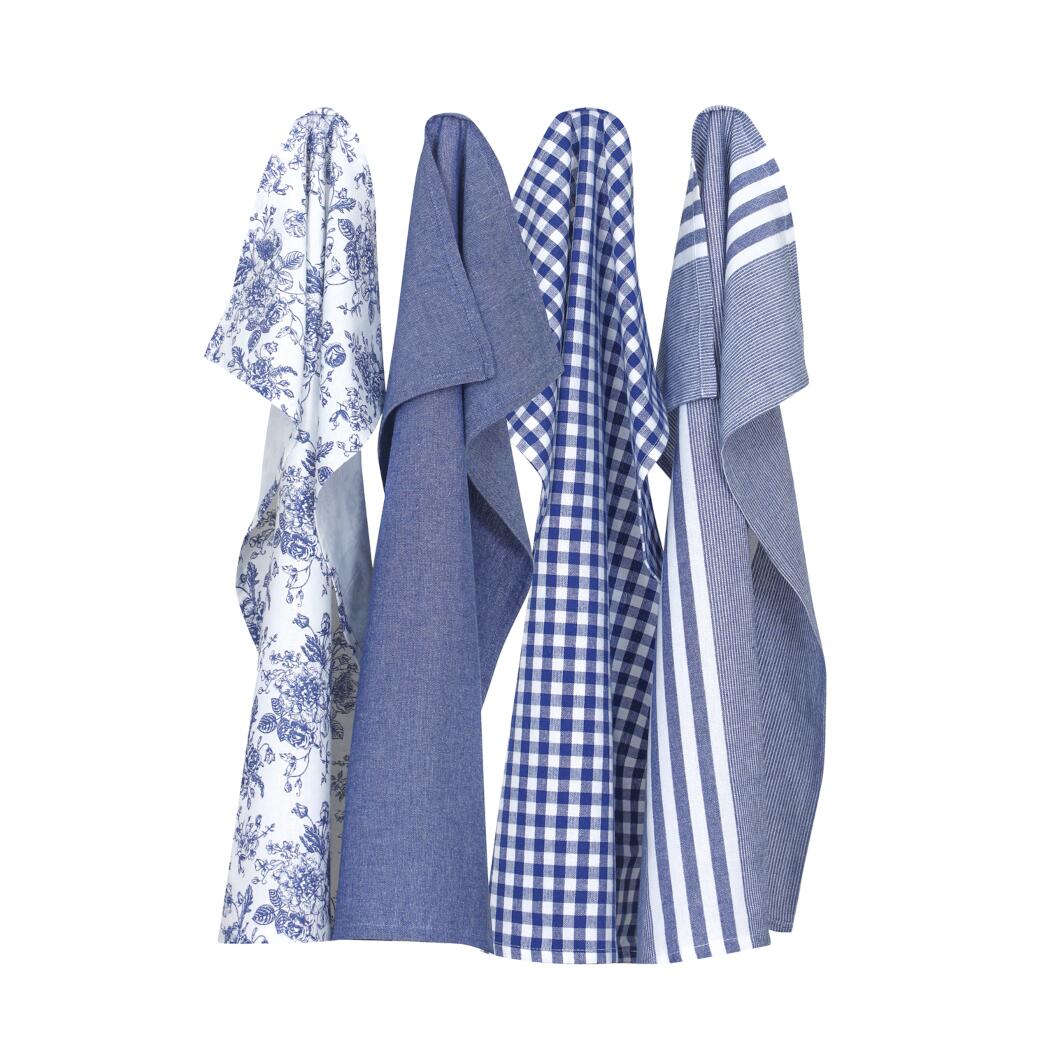 Stl. 4 st. 50x70 cm. Kökshanddukar Recycle i färgerna blått & vitt. Mix av chambray, rutig, blommig och randig. Återvunnet material.