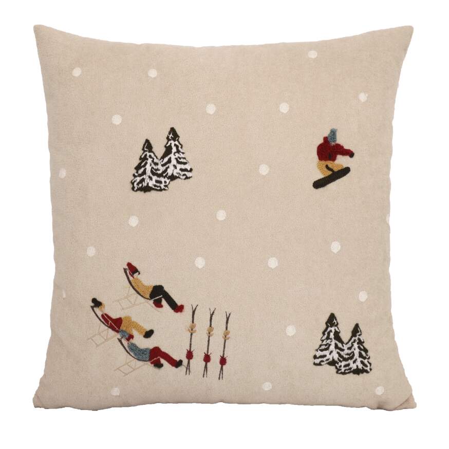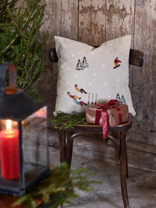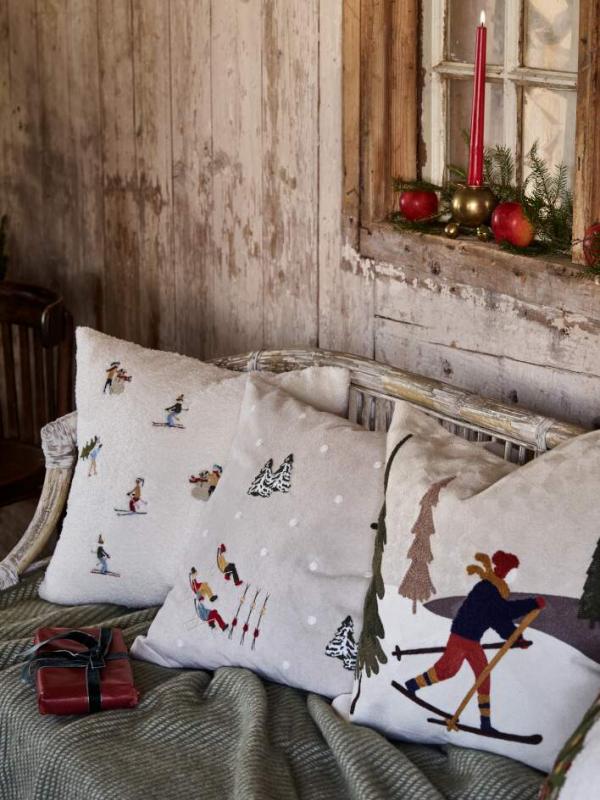 Kuddfodral AFTERSKI, med broderade snowboardåkare, granar och slappande skidåkare