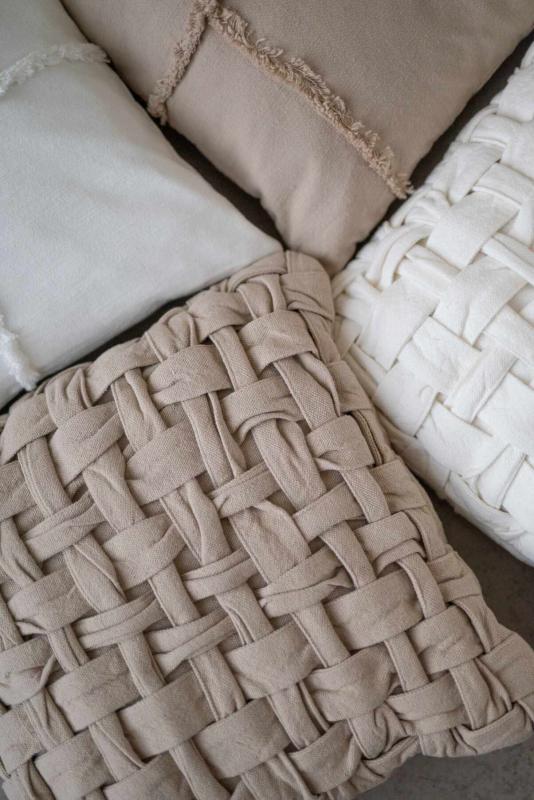 Stl. 48X48 cm. Alex ett enfärgat kuddfodral med bård av frans i samma färg som bildar ett rutmönster. Här i offwhite, finns i flera färger.