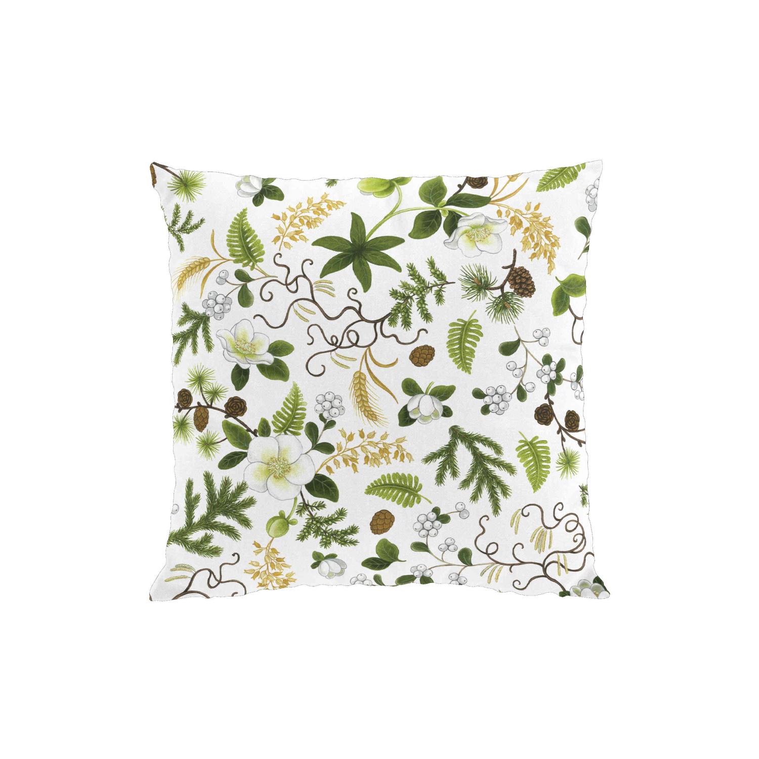 Kuddfodral Barr & Blom med julrosor, kottar och granris i vitt, brunt, gult och grönt