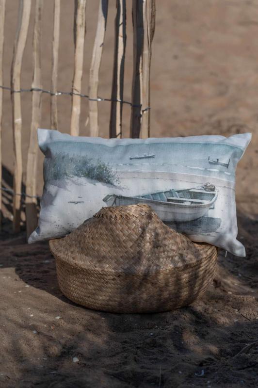 Stl. 35X60 CM. Kuddfodral BÅT är tillverkad av tunn sammet. Det vackra motivet av en träbåt på stranden fångar känslan av lugna dagar vid havet och sprider en varm, maritim atmosfär i rummet.