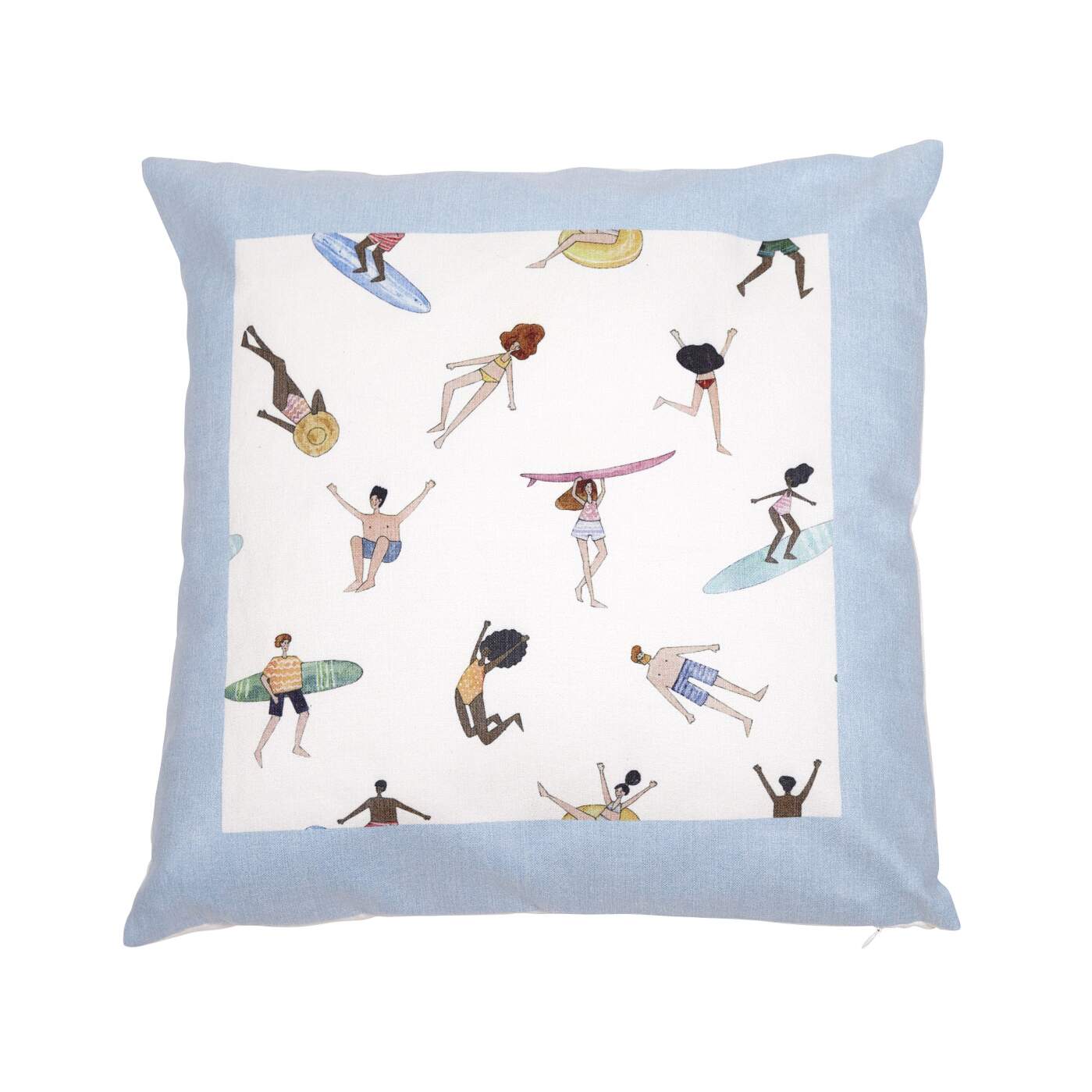 Kuddfodral BEACH med badande, solande och vindsurfande människor, enfärgad blå kant
