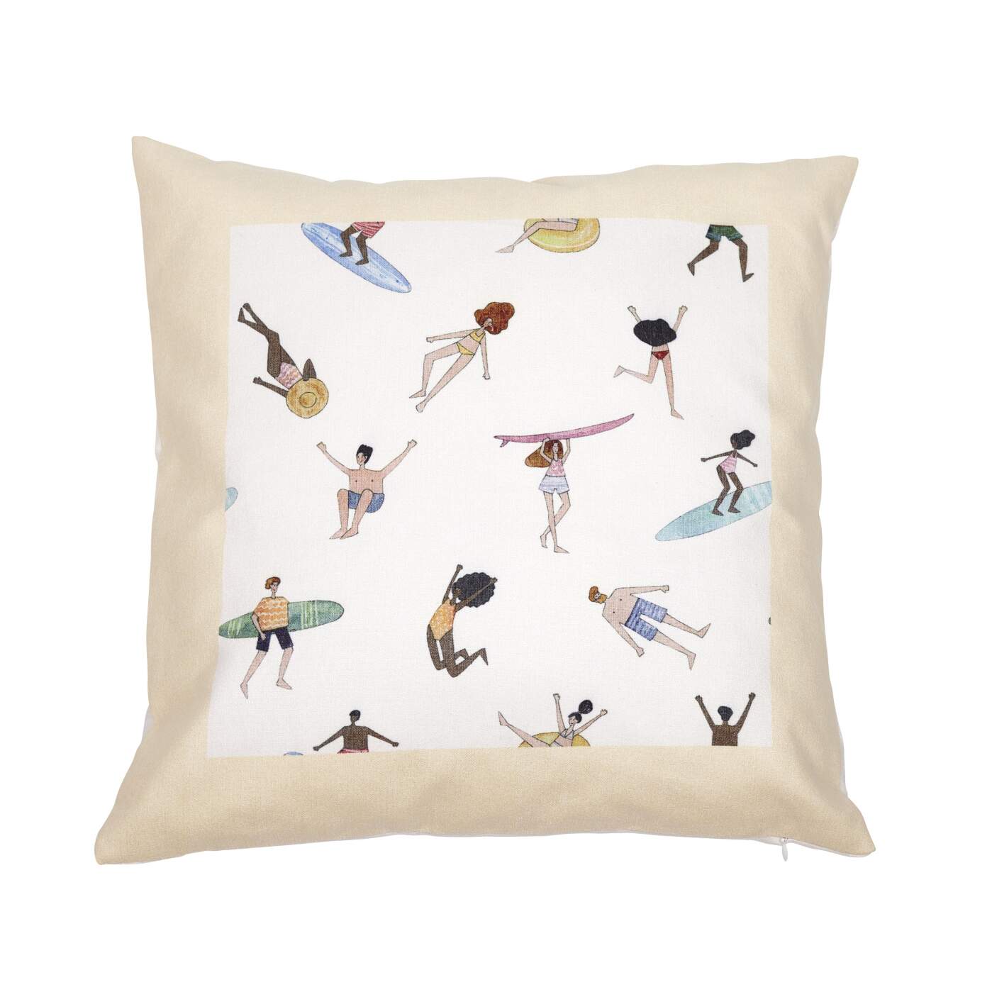 Ett kuddfodral med människor på stranden som solar, badar och vindsurfar. Gillar du produkter med marina motiv så följ länken så hitta du dessa.