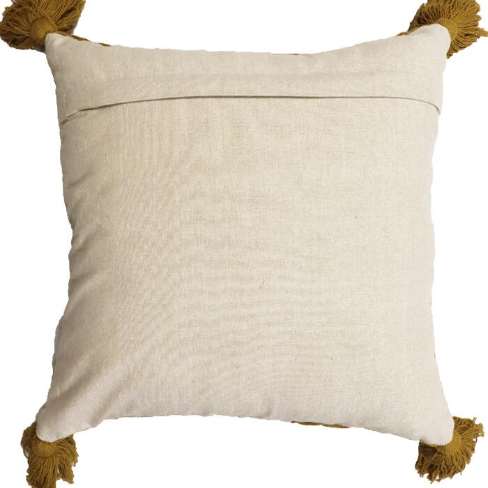 Stl. 45x45 cm. Benji ett enfärgat kuddfodral med flätade trådar på framsidan, tofsar i hörnen och naturfärgad baksida. Färg guld, finns i fler färger.