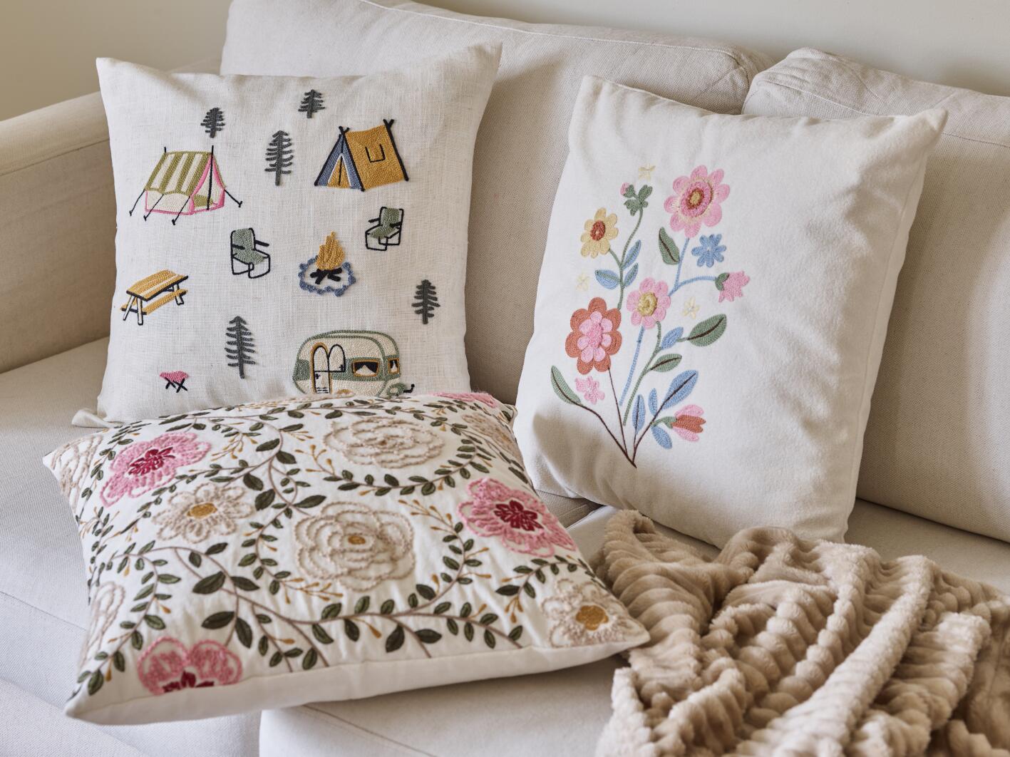 Kuddfodral BIANCA med broderade blommor och blad i rosa, beige och grönt