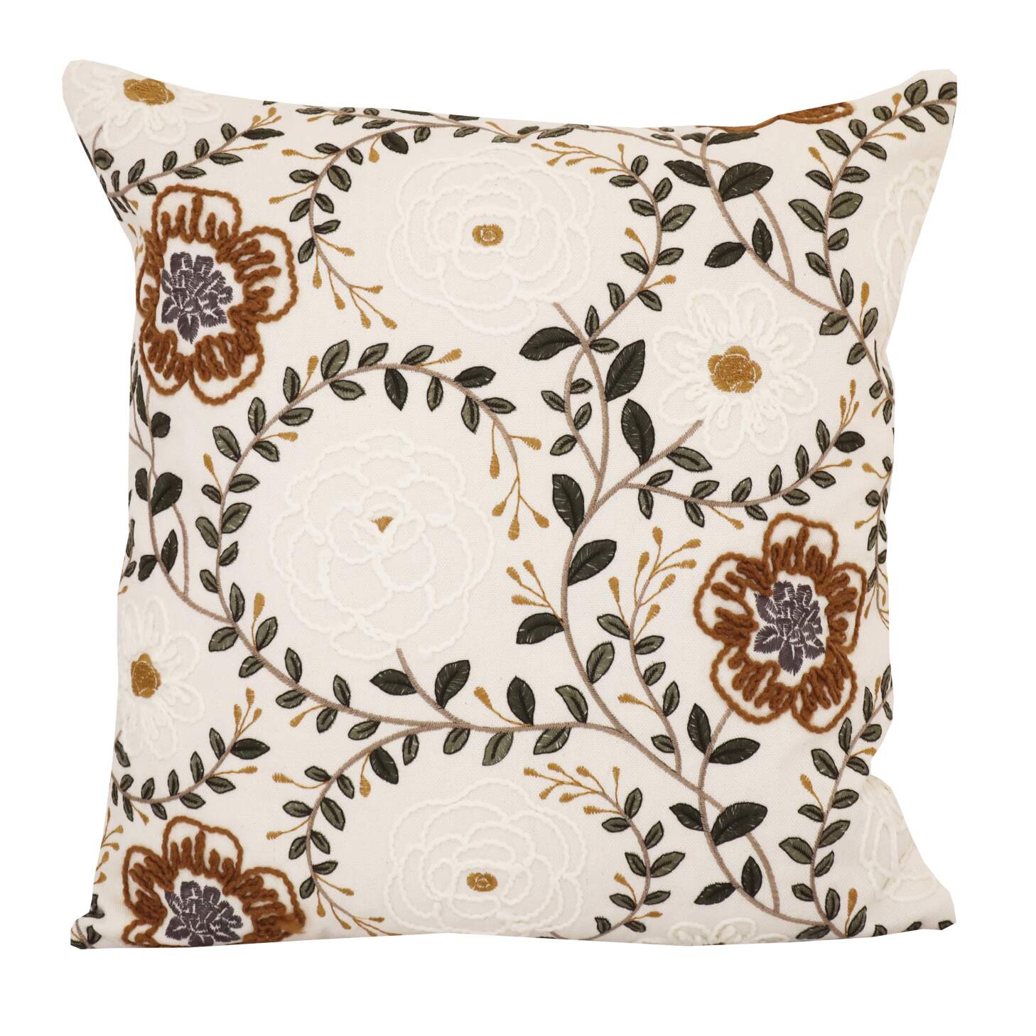 Kuddfodral BIANCA med broderade blommor och blad i rost, vitt och grönt