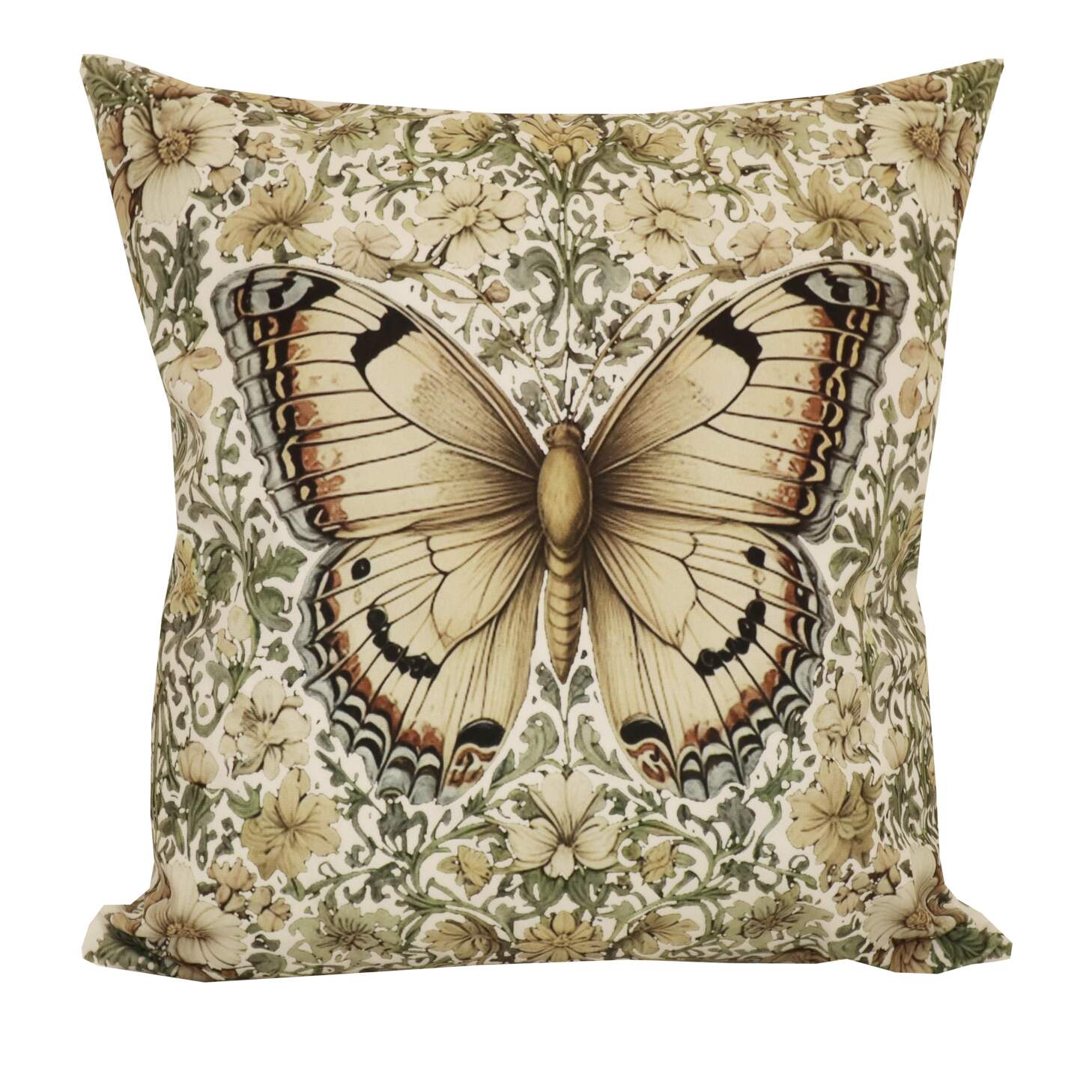 Kuddfodral BUTTERFLY med en stor fjäril och små blommor i beige