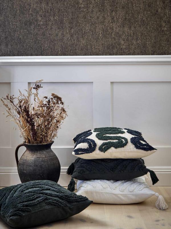 Stl. 45x45 cm. Cooper i mörkgrönt, ett tuftat kuddfodral med tofsar i hörnen, enfärgad slät baksida med dragkedja. Finns i flera färger.