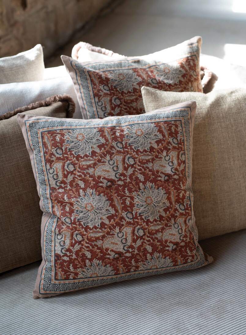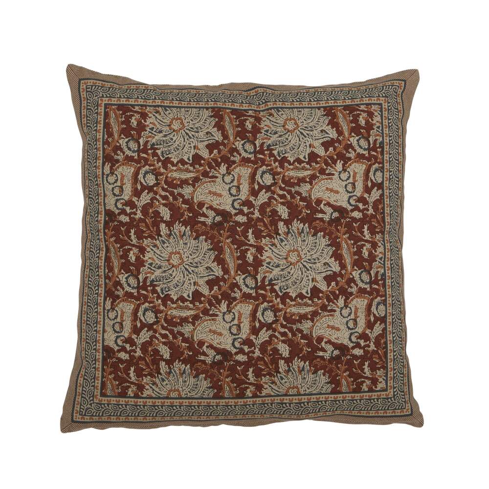 Kuddfodral DANTE, blommig i vinrött och rost med bård runt om