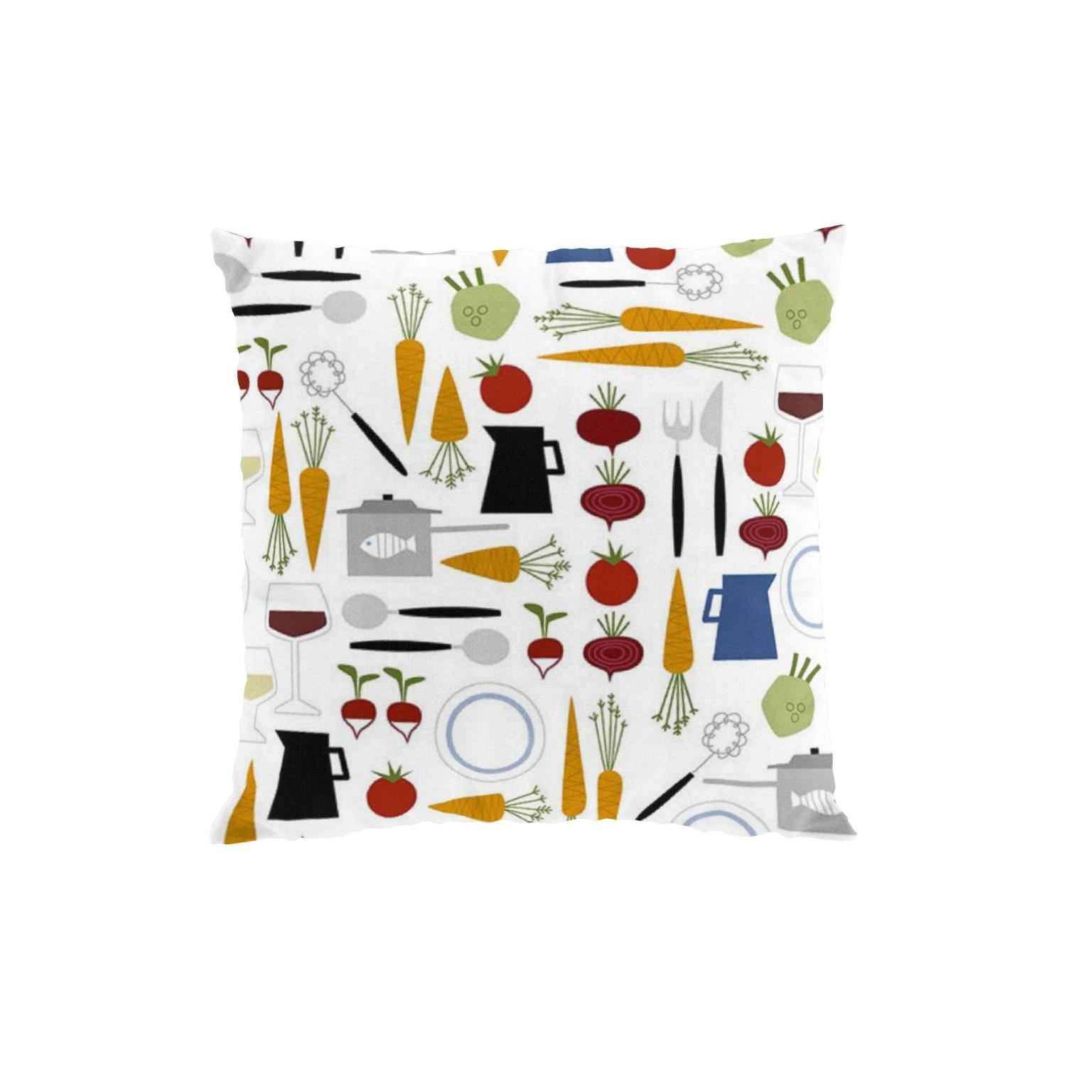 Stl. 47x47cm. Kuddfodral DINNER med olika sorters köksverktyg blandat med olika grönsaker. Kuddfodralet är liksidigt och försluts med dragkedja.
