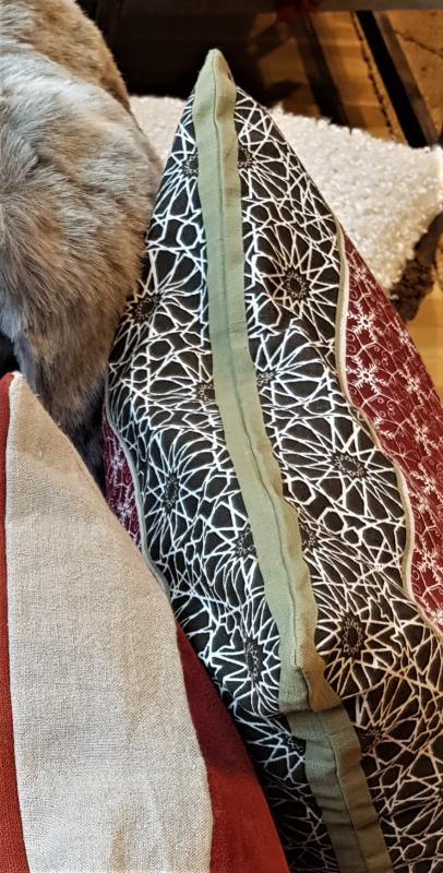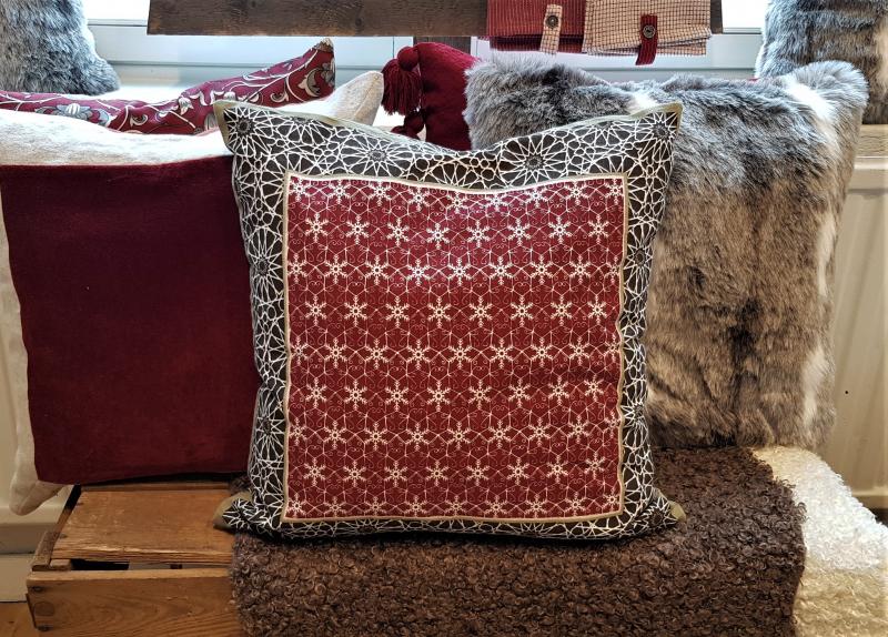 Stl. 48x48 cm. Kuddfodralet EVA, ett kuddfodral med intressant mönster i rött, svart och beige där fram och baksida är lika. 100% bomull