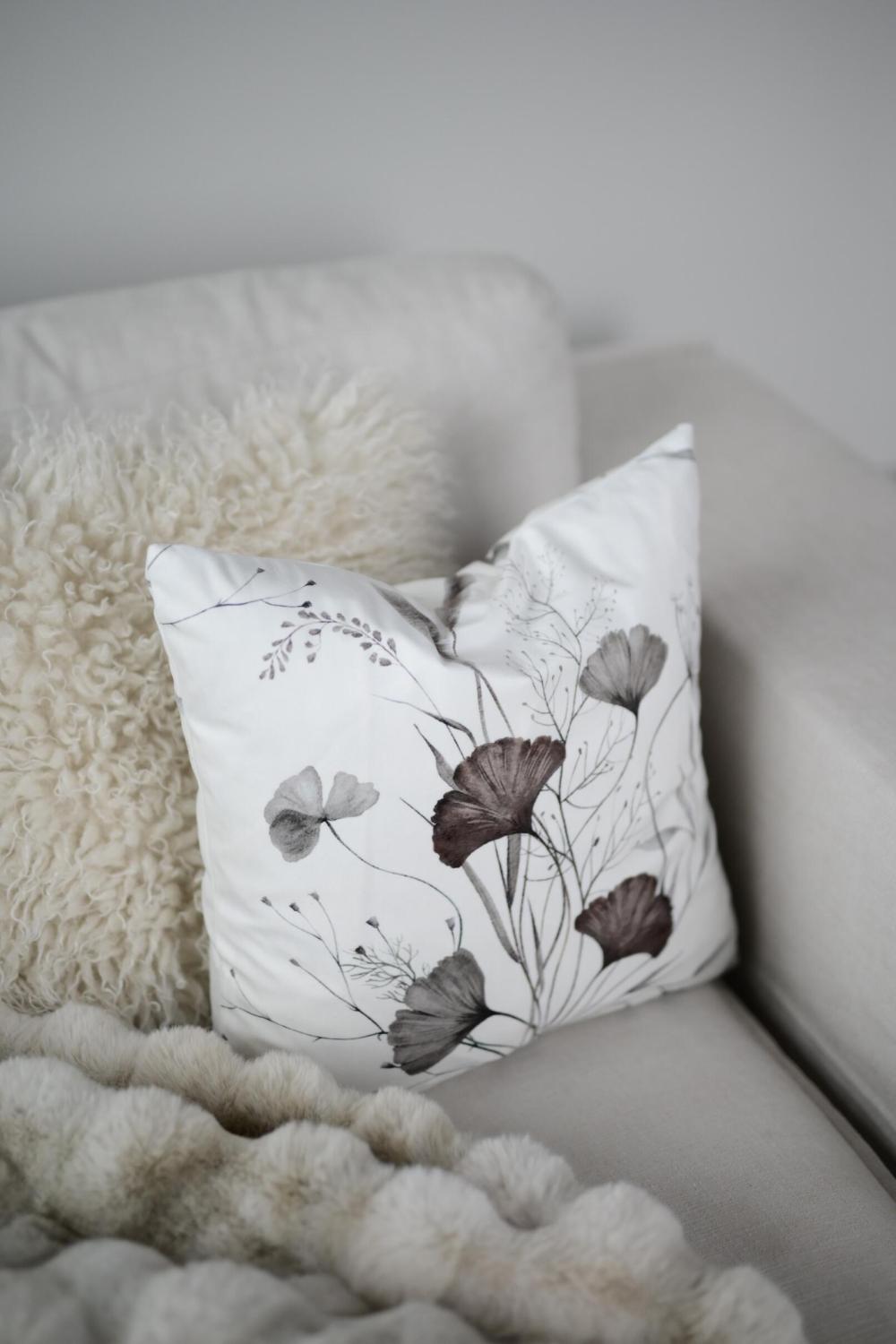 Kuddfodral GISELA med Ginkoblad i beige och brunt, bottenfärg offwhite
