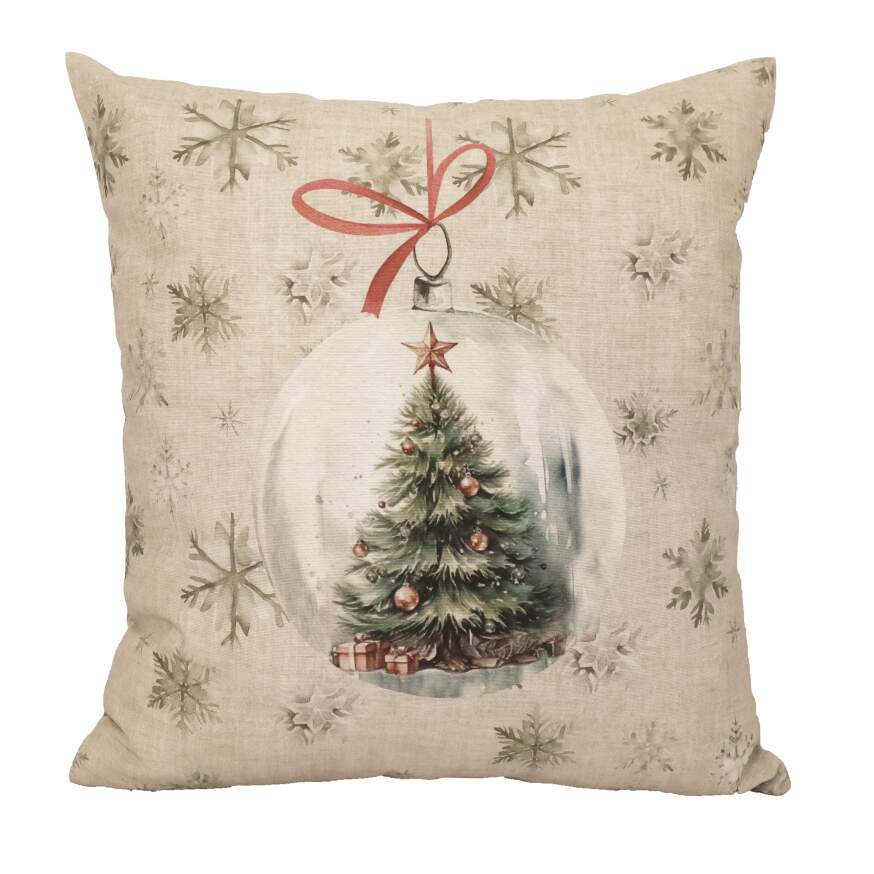 Kuddfodral GRANKULA med en gran i en julkula, linnefärgad botten och snöflingor runt om