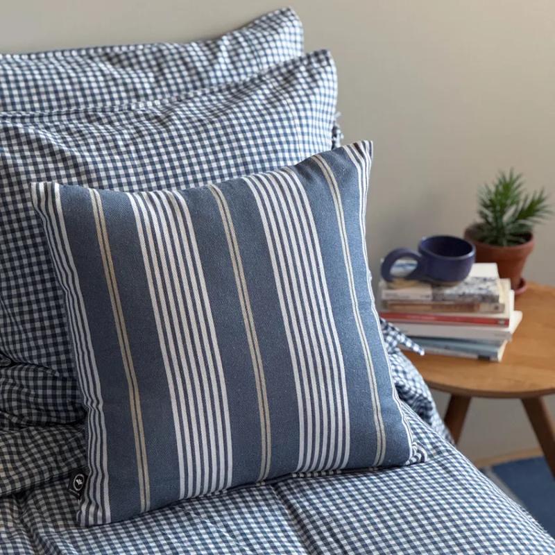Kuddfodral HAMPUS, återvunnet material, randig i marin stil i gråblått, offwhite och beige