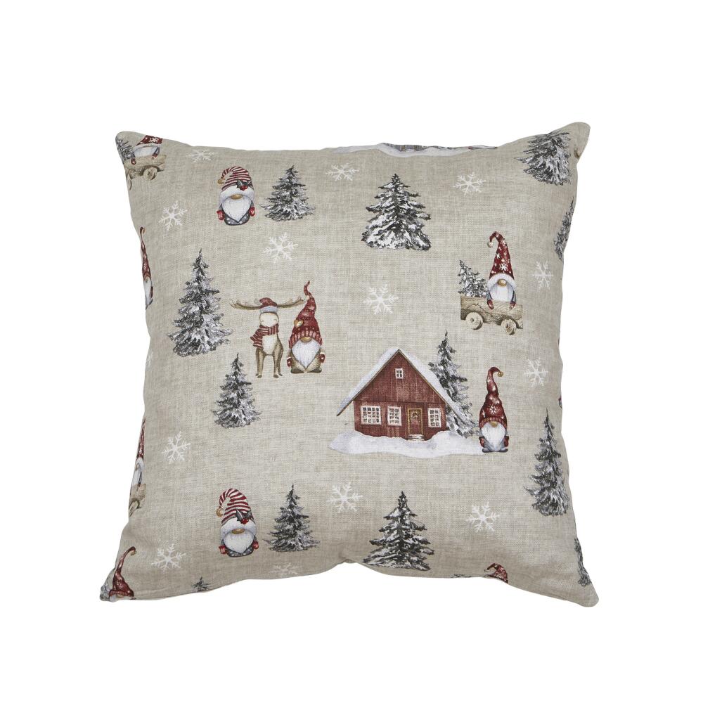Kuddfodral HARALD med tomtar i röda luvor, granar och små hus på linnefärgad botten