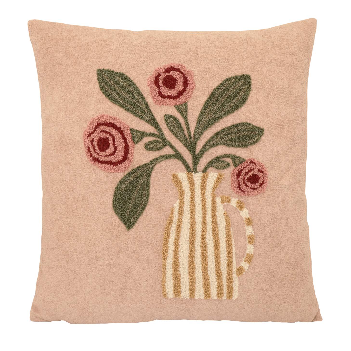 Kuddfodral HARRIET i rosa teddykvalite med broderade rosa blommor i en vas