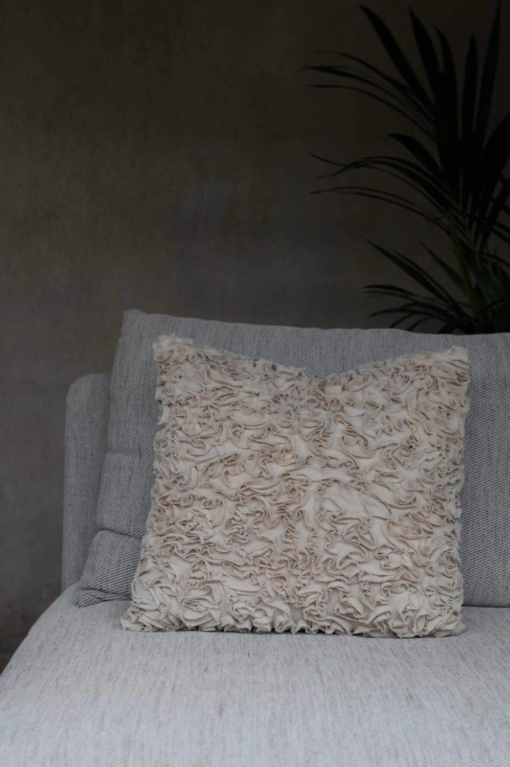 Kuddfodral INSE med klippta remsor i ett virrvarr mönster, sandfärgad