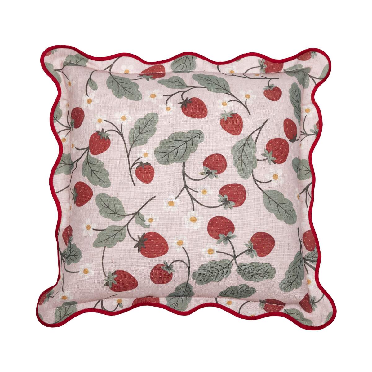 Stl. 45X45 CM. Kuddfodral JORDGUBBE med ett sött jordgubbsmönster av små, klarröda jordgubbar med gröna blad, på en rosa bakgrund Den bågade kanten ger en extra söt och romantisk sommarkänsla.