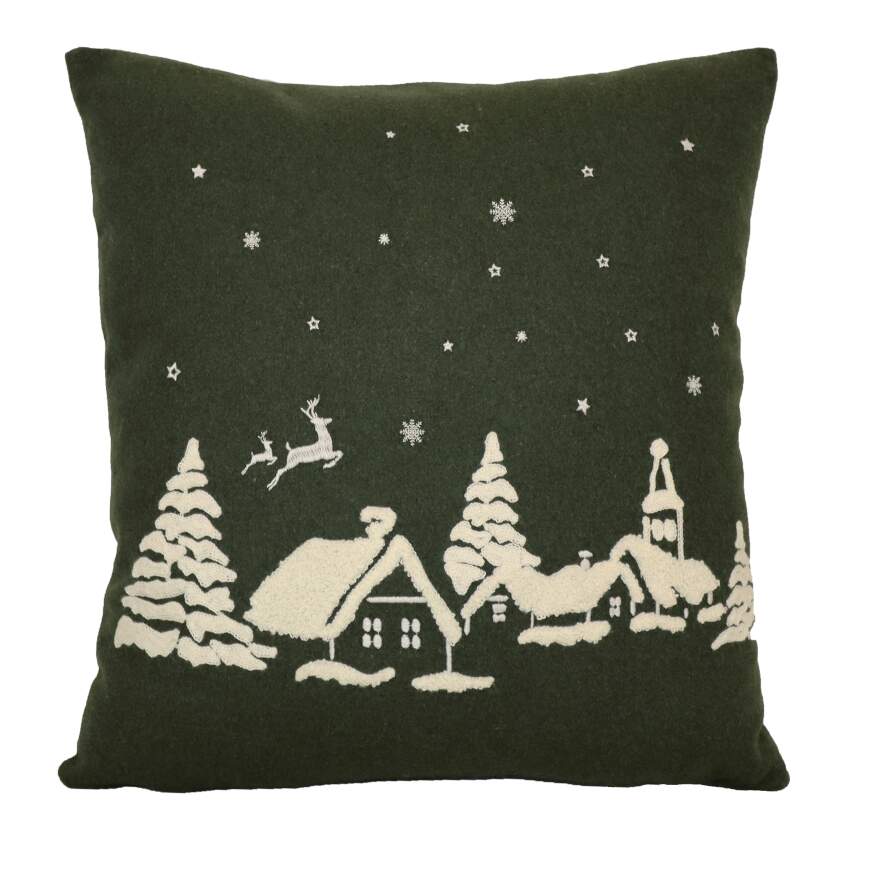 Kuddfodral JULNATT i mörkgrönt filtmaterial med broderad stad i vitt