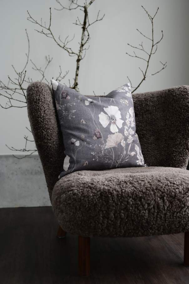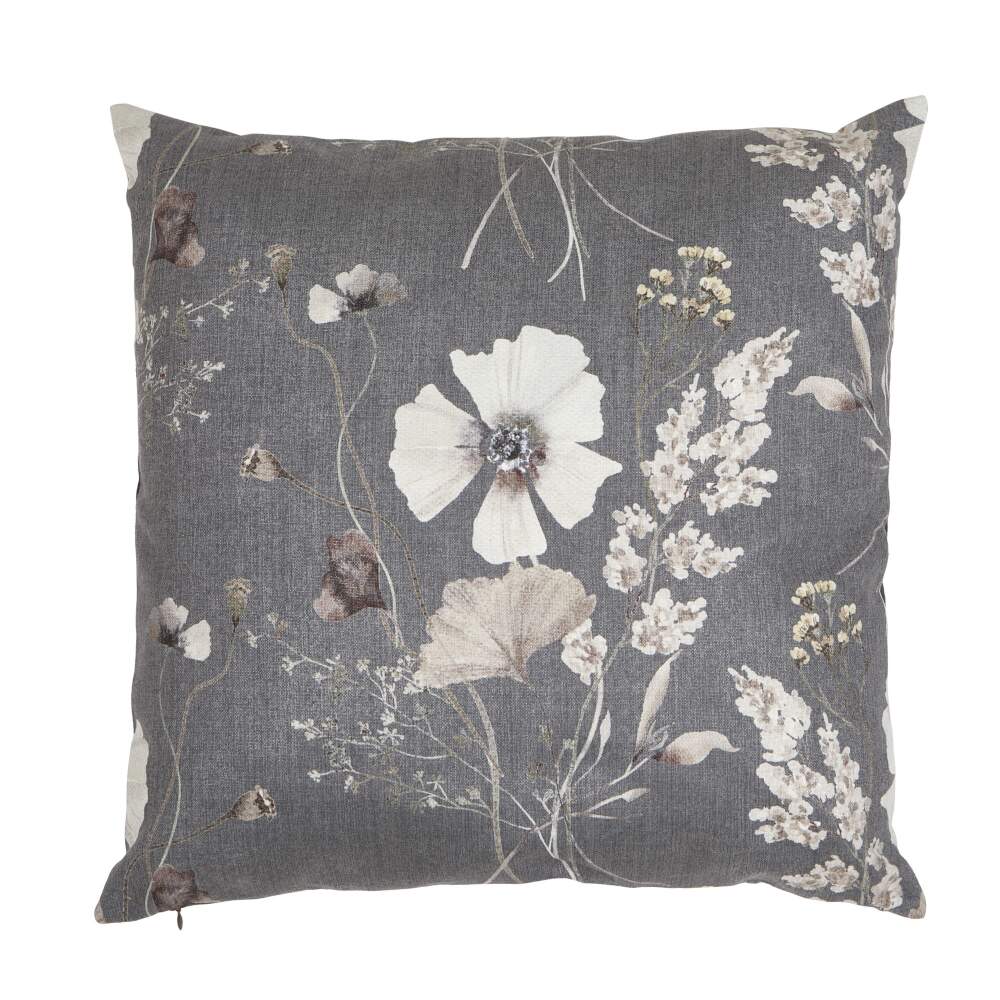 Kuddfodral SABINE med blommor och blad i beige på grå bottenfärg