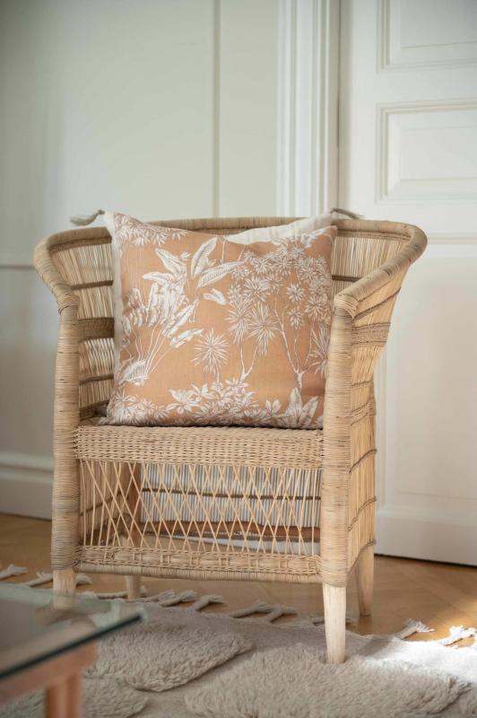 Kuddfodral SASHA med tryckta linnefärgade djungelväxter på gul botten