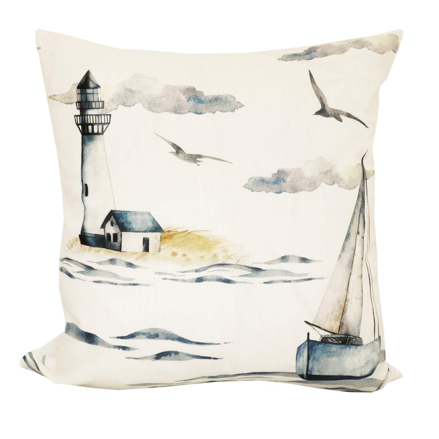 Stl. 45x45 cm, Digitaltryckt kuddfodral SEGLA med fyr, segelbåt och fiskmåsar i marint tema. Enfärgad baksida