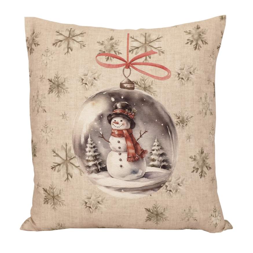 Kuddfodral SNÖGUBBE i en julkula, linnefärgad botten och snöflingor runt om