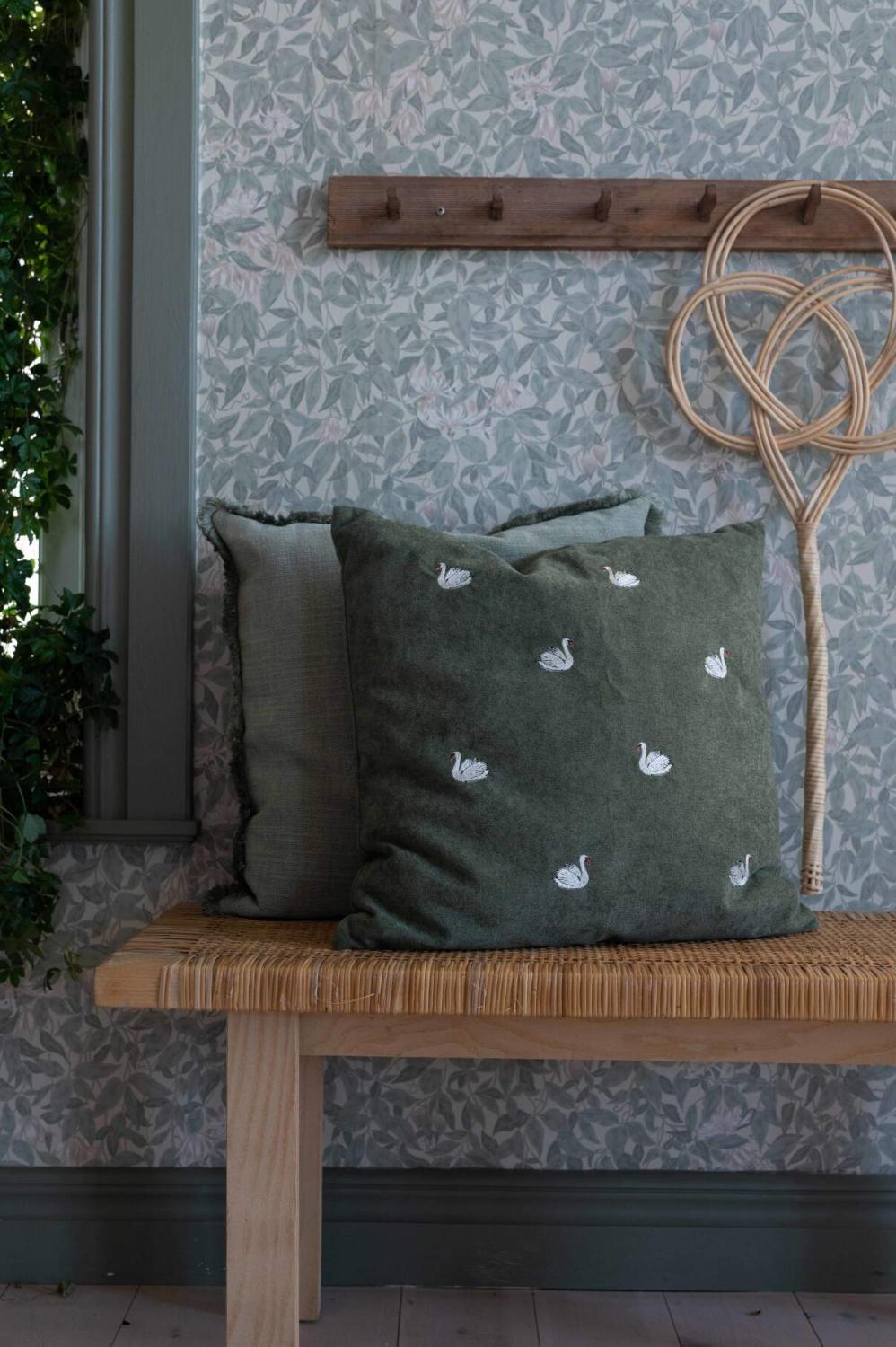 Kuddfodral SVAN i grönt med vita små svanar