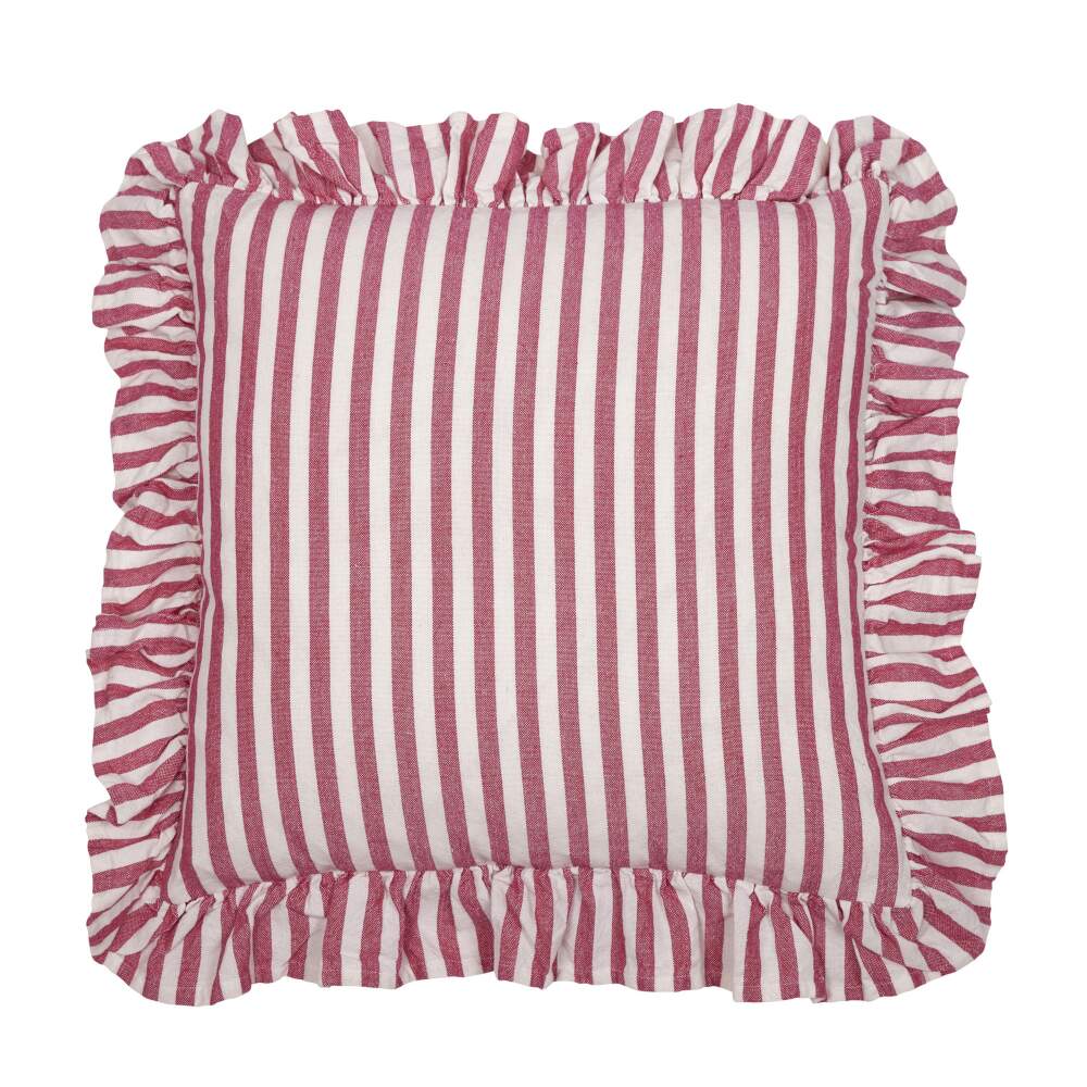 Stl. 45X45 cm. Kuddfodral SVEA med klassiskt smalrandigt mönster och en romantisk volang runt kanterna. Finns som hel serie med produkter.
